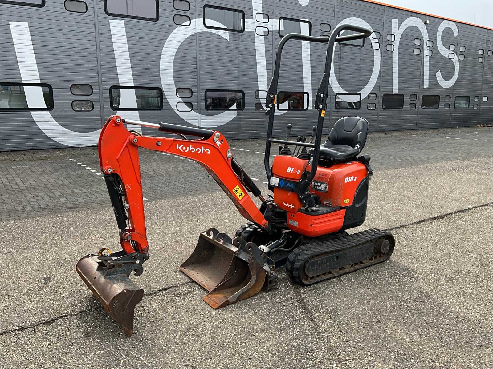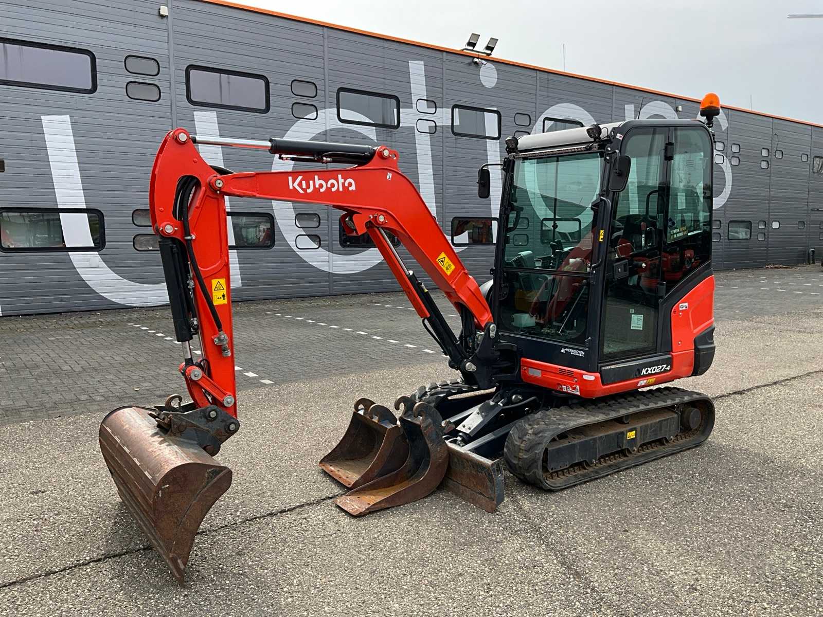 Aggancio rapido idraulico CW05, cestello CW05 100cm, retroexcavatrice CW05 40cm, CW05 secchio banana 24cm, 3ª funzione pronta, carrello regolabile da 99cm a 130cm, 2ª velocità, radio, barra LED frontale, filtro Kubota antifurto inclusa chiave rossa Auction-ID: A1-45424-20