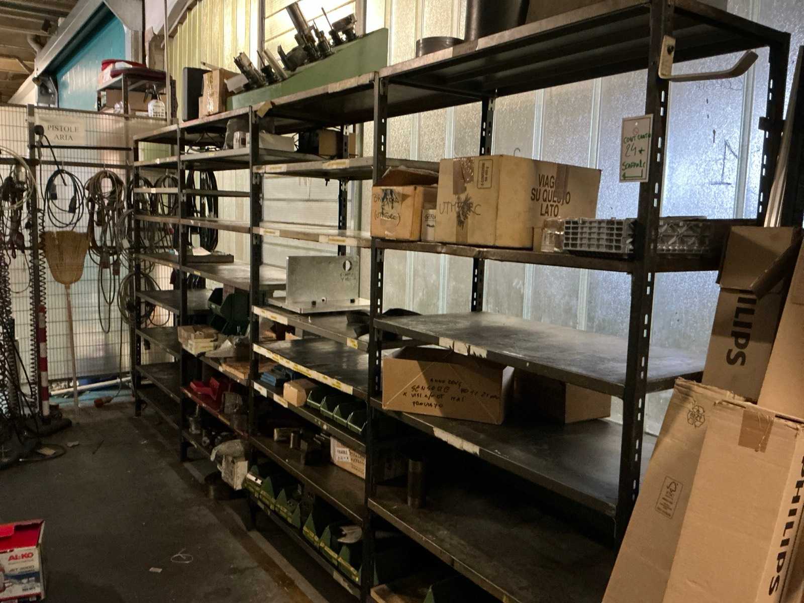 Contenuto e scaffali Dimensioni campate: 1000 × 500 × 1900 mm, per un totale di quattro campate. Non è incluso il contenuto composto da alcuni ricambi destinati ad altri macchinari già posti in vendita con la corrente asta. Non si assicura pertanto la consegna di tutti gli elementi visibili in foto, ad eccezione della scaffalatura. Si consiglia ispezione. Auction-ID: A7-45181-24