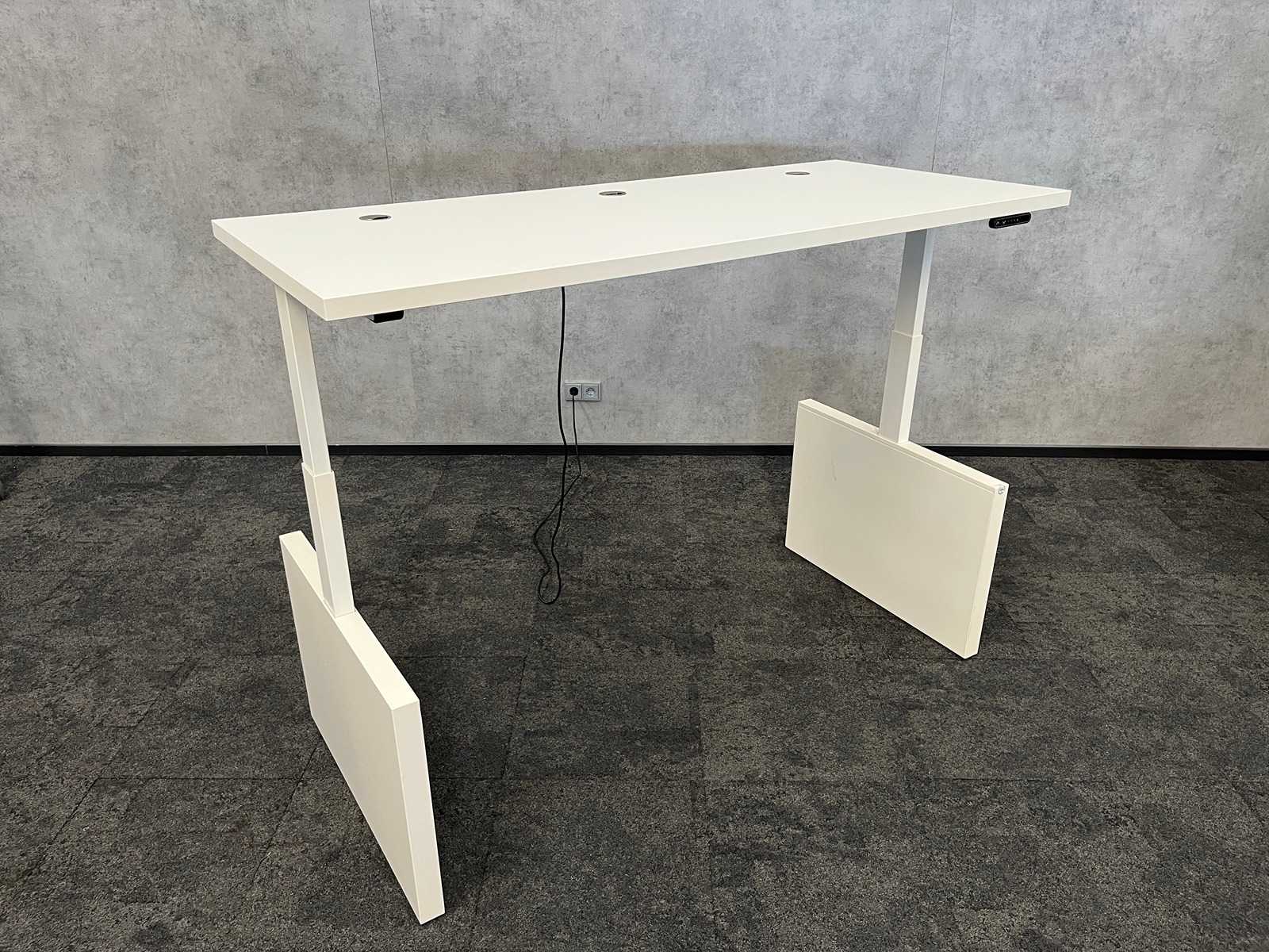 Lotto composto da una scrivania elettrica con seduto e supporto con ingresso a cavo, condotto per fili e cassetto della scrivania. Scuro. altezza approssimativa 61-126 cm. Larghezza 140x80 cm. ----- sedia ergonomica Senator 1x con braccioli regolabili in 4D, altezza e profondità del sedile regolabili, schienale con meccanismo inclinabile/seduta attiva, supporto lombare e rivestimento in rete ----- armadietto di stoccaggio 1x estedibile. Scuro. circa hxbxd 110x44x81 cm. Auction-ID: A1-44654-202