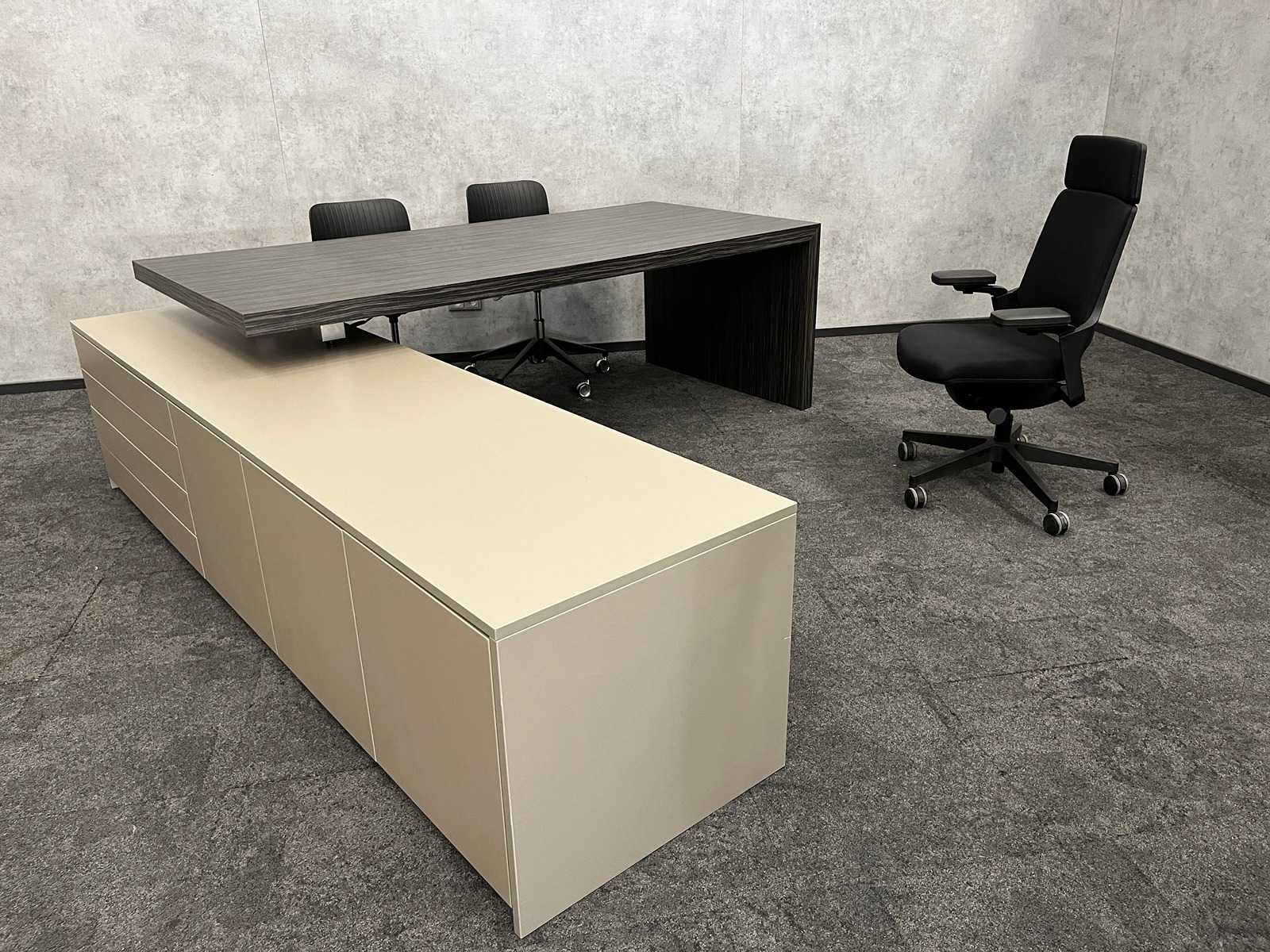 lotto composto da sedia da ufficio ergonomica Interstuhl v.v. 3D braccioli regolabili, altezza e profondità del sedile regolabili, poggiatestiere e sedute attive. --- presidente della conferenza mobile 2x Segis Dragonfly. Mobile, regolabile in altezza e rotabile --- scrivania executive con armadietto. Scuro. Piano della scrivania circa altezza x larghezza 75x220x100 cm. Scuro. Armadio circa hxbxd 59x260x64 cm. (mobile e desktop sono separati e non confezionati). Auction-ID: A1-44654-70