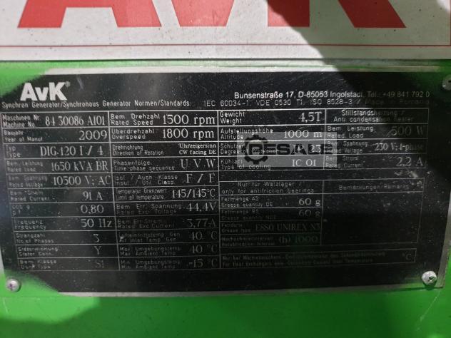 Engine Model J 416 GS Engine Version A305 Unit Serial No. 6412011 Engine Serial No. 6412021 Fuel Gas Natural gas YOM 2009 Power output (kWel) 1222 Status of Operation stopped Operating hours 68,000 Alternator Make AVK Alternator type / model DIG 120 I / 4 Alternator Serial No. 8430086 A101 Alternator Rating [kVA] 1650 Alternator Voltage [V] 10500 Frequency [Hz] 50 Scope of Supply Genset Included: Main gas train, Heat Exchanger on unit (oil+IC), Exhaust Heat Exchanger, Dia.ne control panel