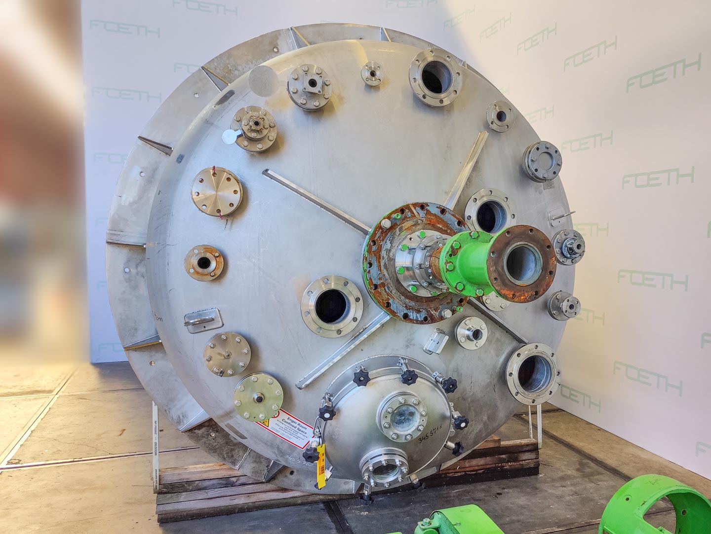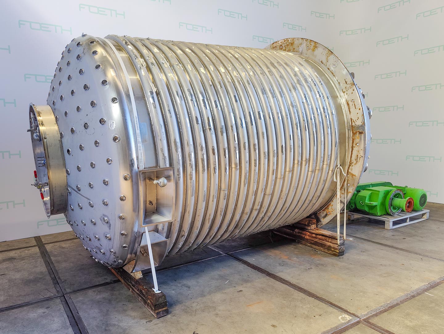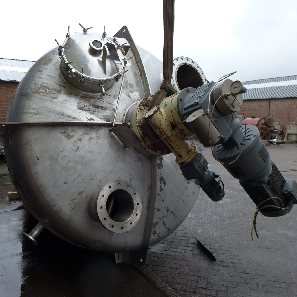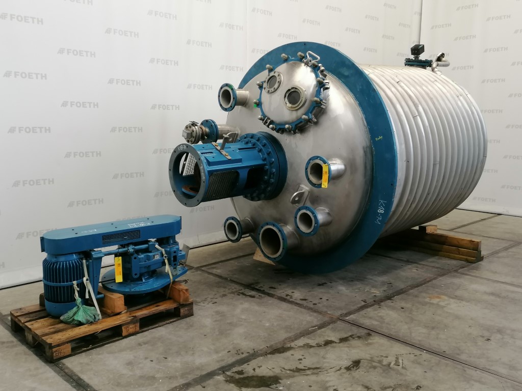 General SKU345S768 MakeHinke Tankbau GmbH (AT) Type16.620 Ltr No.8295 Year of construction2000 LocationBarneveld Pressure Working pressure3.5 Bar Vacuum possiblecheck Working pressure jacket9 Bar Vacuum possible jacketcheck Main Features MaterialStainless steel Volume13000 Ltr. Motor30 KW Specified Features - Stainless Steel Reactor Reactorcheck Capacity13.000 Ltr (max.: 16.620 Ltr) Vessel sizesdia. 2400x4000 mm Dished bottomcheck Dished top sidecheck ManholeDN600 Top connectionsDN200, DN150, DN100, DN80, DN50 OutletDN80 Half coil jacketed(447+57 Ltr) Max. temperature-25/200 °C With paddle stirrercheck (SDR 45-10 S) Motor30,0 kW, 400/690 Volt (EExdeIICT4) Speed mixing shaft65 rpm Stainless Steel Reactors MaterialStainless steel 1.4571 (316Ti) Information Floorspace2,8x2,4 m Total height4 m ATEX compatiblecheckFine chemicalsOther chemicalRubberAgrochem ...