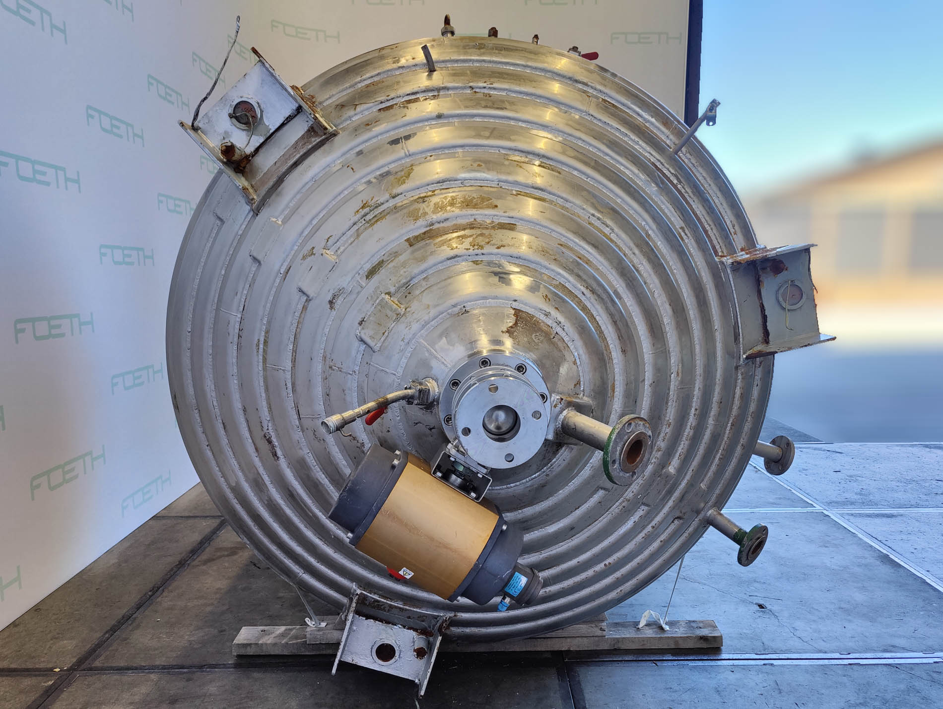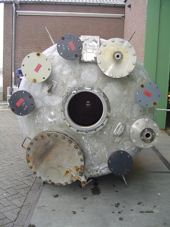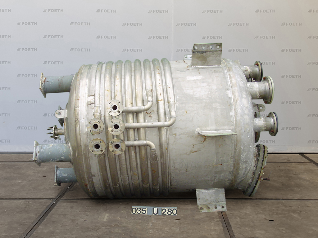 General SKU035U280 LocationBarneveld MakeBehälter, Apparate- u. Maschinenbau, Kürten No.6380-2 Pressure Working pressure6 Bar Vacuum possiblecheck Working pressure jacket32 Bar Vacuum possible jacketcheck Main Features MaterialStainless steel Volume5750 Ltr. Specified Features - Stainless Steel Reactor Reactor(1x) Capacity5750 Ltr Vessel sizesdia. 1800x1750mm Dished bottomcheck Dished top sidecheck Manholedia. 600mm Top connectionsdia. 300mm + 2x dia. 200mm + 3x dia. 150mm Outletdia. 100mm Half coil jacketed(150 Ltr) Max. temperature250 Degr. C. Without motorand without stirrer Stainless Steel Reactors MaterialStainless steel 1.4571 (316Ti) Information Year of construction1989 Total height3,2 MFine chemicalsOther chemicalRubberAgrochemicalsPlastic & polymersCatalysts & fillersSolventsDiscountDetergent & surf.Other pharmaceuticsCosmeticsOrganicsLubricants & ...