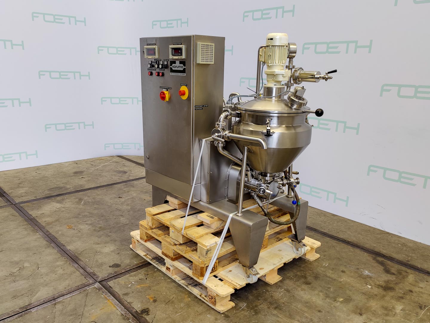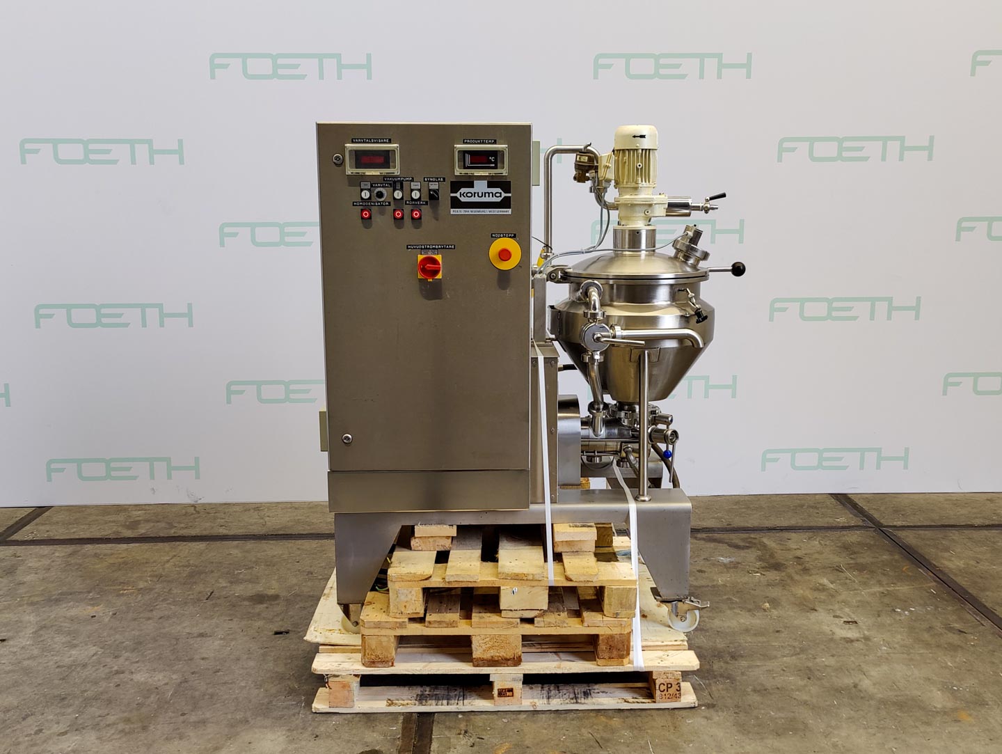 General SKU412U1294 MakeFryma Koruma Disho LocationBarneveld TypeV100/45 Pressure Vacuum possiblecheck Working pressure jacket6 Bar Main Features MaterialStainless steel Volume45 Ltr. Motor5.5 KW Specified Features - Processing vessel MaterialStainless steel 1.4571 (316Ti) Closed stirring vesselcheck Capacity45 ltr Vessel sizesDia. 500x420mm ( polished inside) Conical bottomcheck Dished top sidecheck With covercheckDia 500mm Top connectionsInlet dia. 325mm ( with hopper) OutletDia. 30mm With jacketcheck Volume 5,2 ltr, pressure 6 bar, allowable temp 180°C Max. temperature180°C With anchor stirrercheck with scraper Motor0.25kW, 220/380Volt, 1380rpm With homogenisercheck Dia. 100mm, 0-5000rpm Motor5,5kW, 0-270Volt, 0/5000rpm Information No.4.027 Year of construction1988 Mounted on legscheck With switchgearcheck Floorspace1,4x1,35 m Total height1,45 m W ...