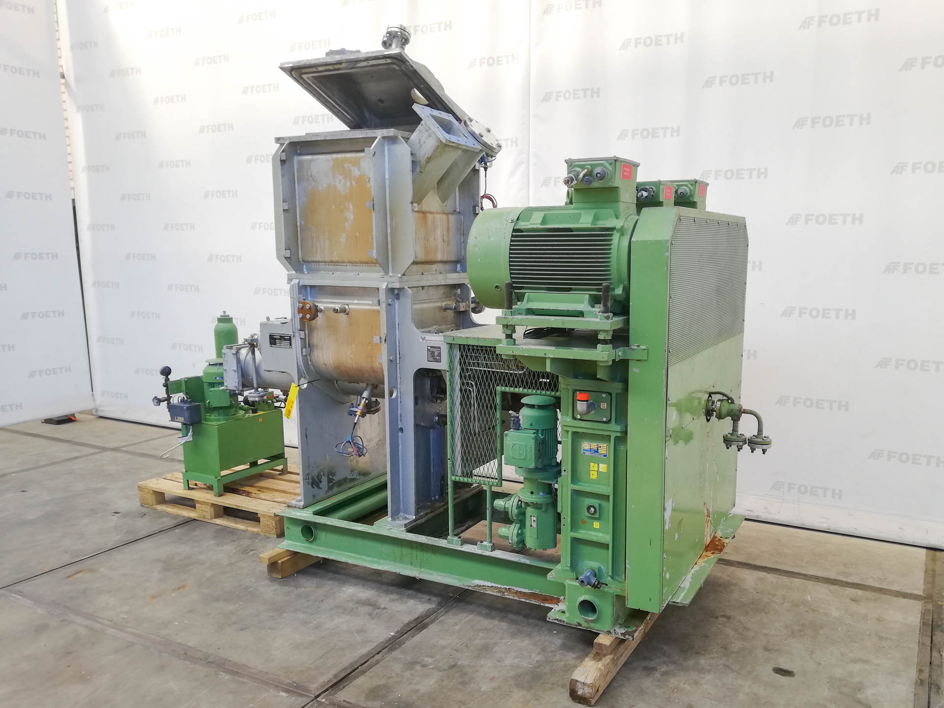 General SKU402S948 LocationBarneveld MakeWerner & Pfleiderer (DE) TypeUK80 AES Pressure Working pressure6 Bar Vacuum possiblecheck Main Features MaterialStainless steel Volume80 Ltr. Motor30 KW Specified Features - Z-blade mixer Z-blade mixercheck Capacity80 Ltr. With covercheck With jacketcheck Max. temperature180 °C Arms can be heated/cooledcheck Double gearedcheck Motor30 kW 500 V 1450 rpm (Ex) Arm speed20-40 rpm With hydraulic unitcheck Screw dischargecheck Motor11/18 kW 500V Ex With variable speed drivecheck Screw speed750-1500 rpm MaterialStainless steel Information No.229808 Year of construction1990 Mounted on framecheck Floorspace2,6 x 1,7 m Total height2,3 m Weight5000 kg ATEX compatiblecheckStarchOther chemicalRubberPlastic & polymersZ-blade mixersCatalysts & fillersFeed additivesPaper & otherDetergent & surf.Other pharmaceuticsCosmeticsSuga ...
