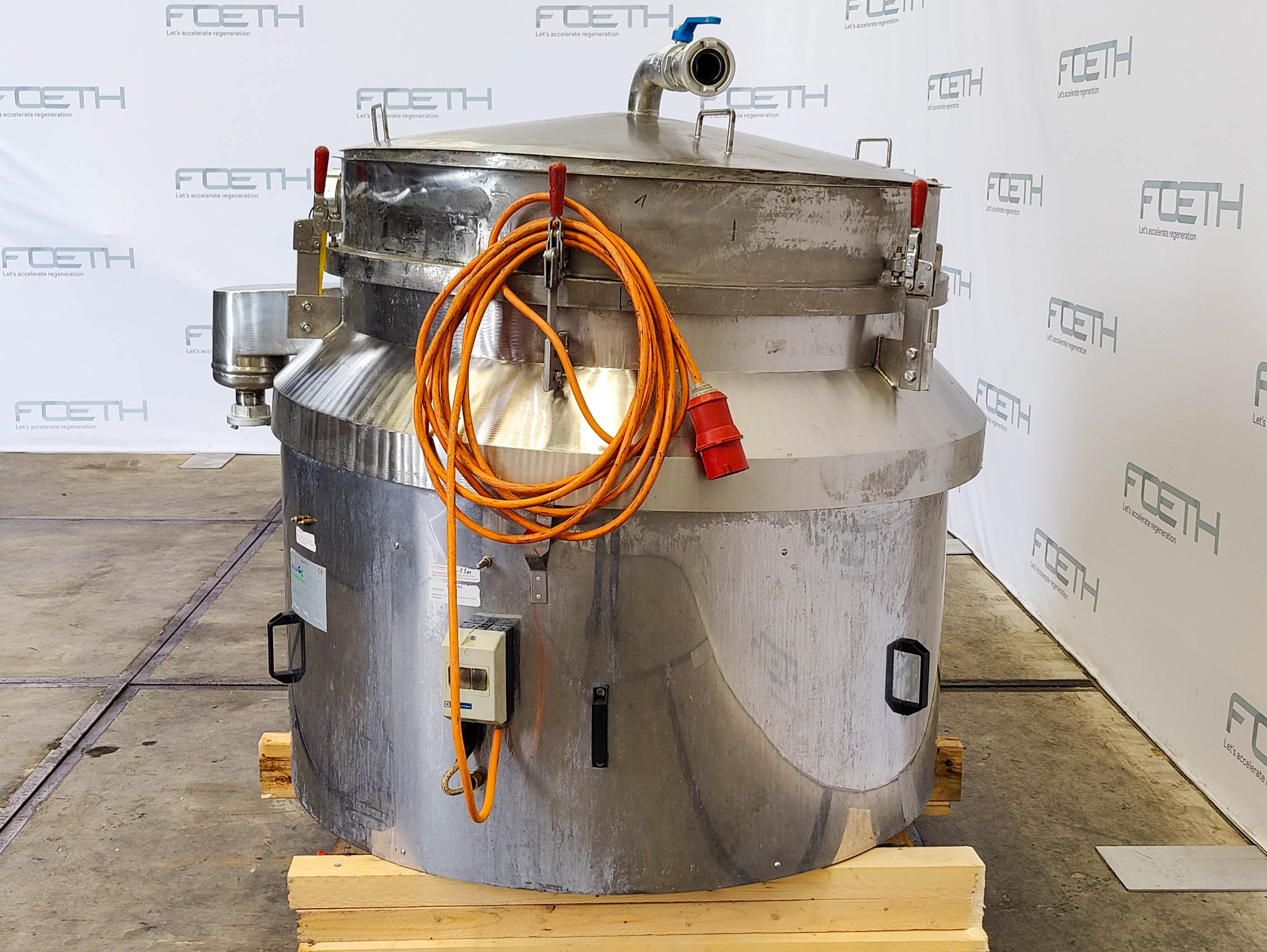 General SKU390T1166 LocationBarneveld MakeA. Bolz Wangen TypeDB-900-M3 Pressure Working pressure0.1 Bar Main Features MaterialStainless steel Volume9000 Ltr. Motor18.5 KW Specified Features - Conical mixer MaterialStainless steel 1.4404 (316L) Conical mixercheck Density1.16 kg/dm³ Capacity9000 Ltr. (Bruto. 18000 Ltr.) Largest cone diameter3330 mm Cone height5205 mm ManholeDN700 With stainless steel armcheck Motor1: 18,5 kW, 2: 2,2 kW With variable speed drivecheck screw speed (nominal): 66 rpm, arm speed (nominal): 0,7 rpm Motor3 kW Bottom bearing pintle bearingcheck Max. temperature100 °C Bottom dischargeDN 250/300 (side) Information No.M041305 Year of construction2000 Floor space3,6x3,6 m Total height6,5 m Weight7250 kg ATEX compatiblecheck Extra SpecificationsThis conical mixer has also a Bolz product discharge, specifically type NW250/NW300. It can ...