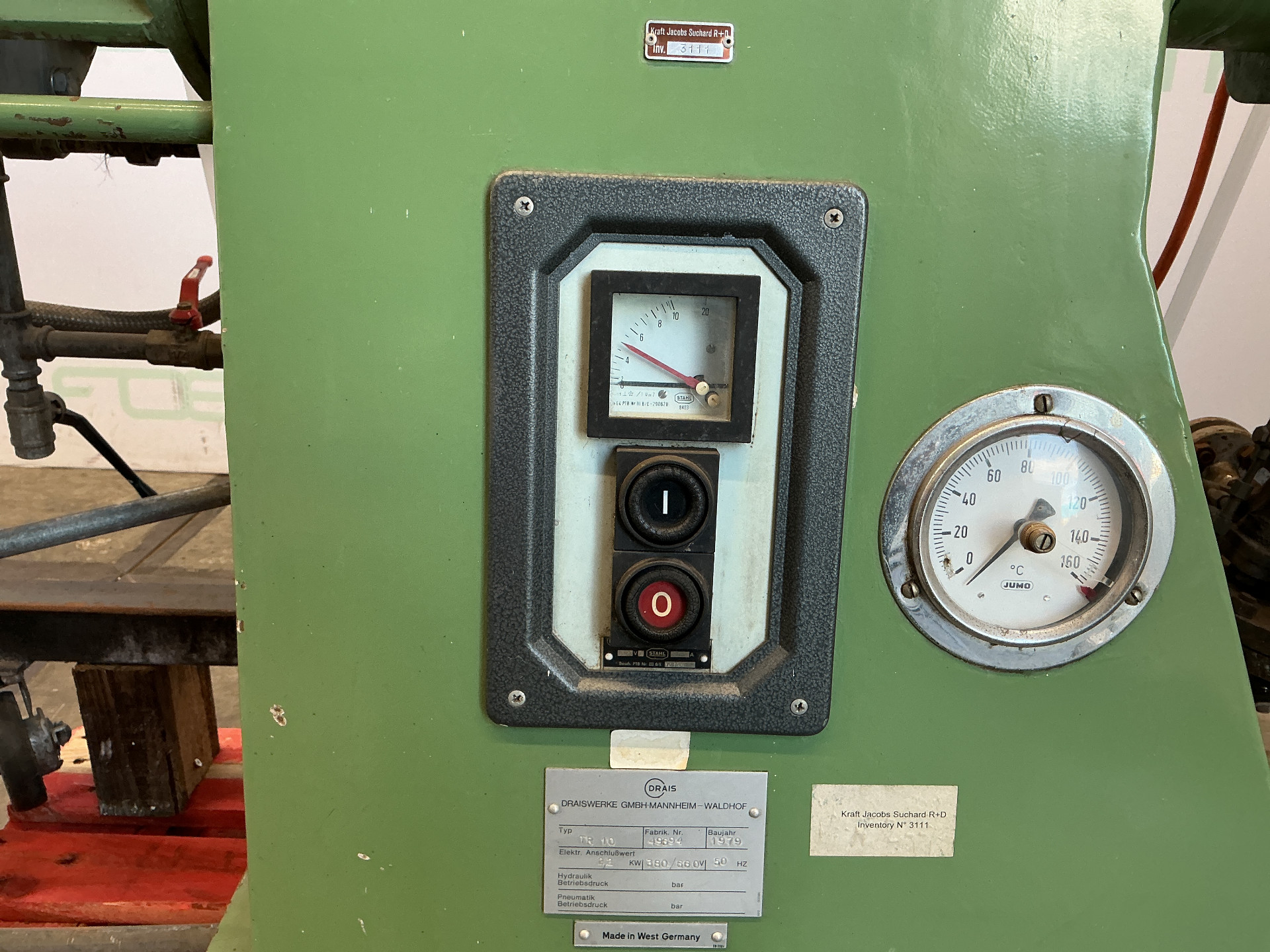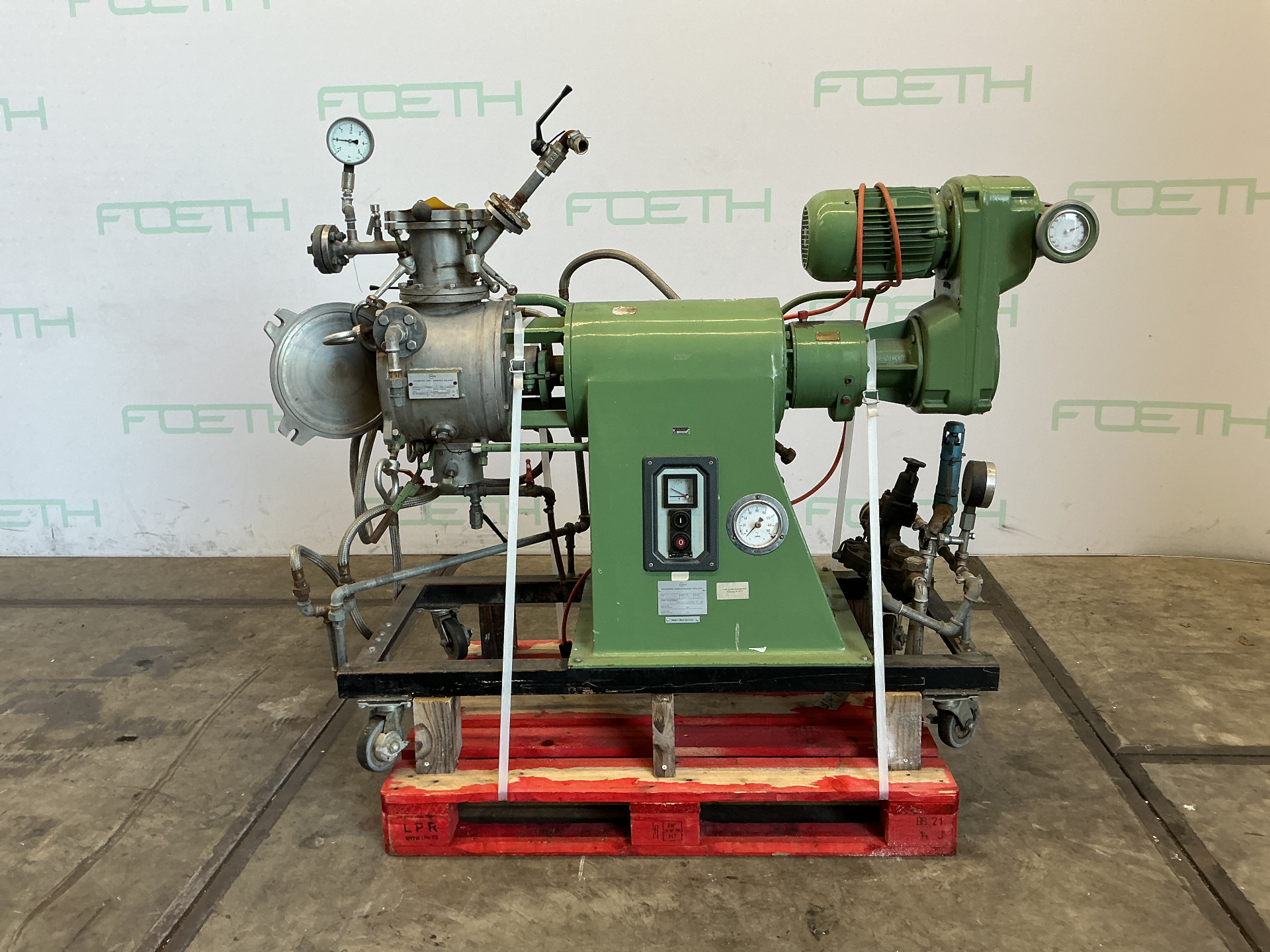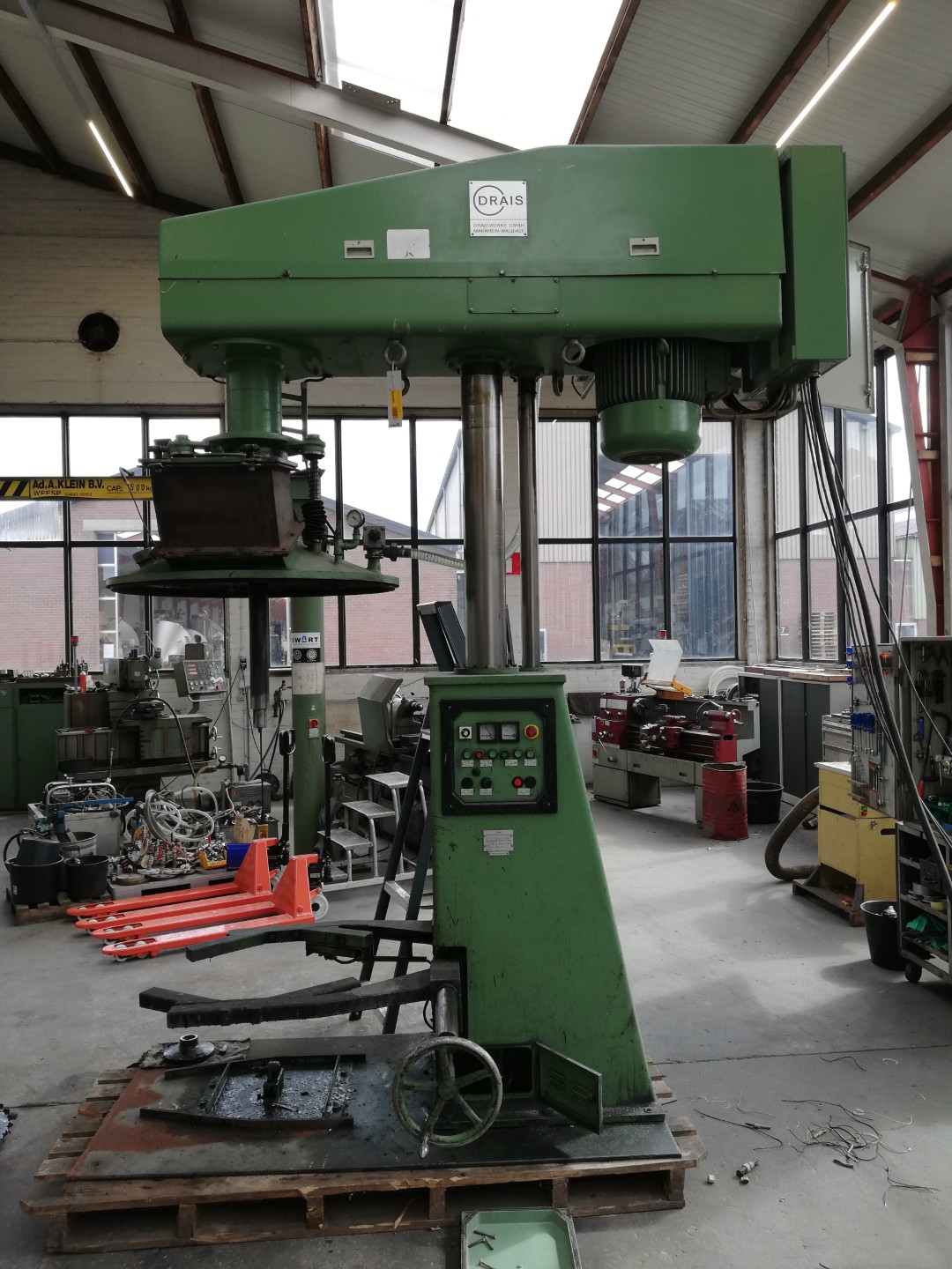 General SKU098Y766 MakeDrais TypeRN 2/30 VAC No.51789 Year of construction1984 LocationBarneveld Pressure Working pressure0 Bar Vacuum possiblecheck Main Features MaterialMild steel Motor30 KW Specified Features - Dissolver Dissolver(1x) Shaft length± 700mm Disc diameter600mm Between shaft and frame± 550mm With covercheck Motor30,0 kW (400 V, 1475 rpm) With variable speed drivecheck With hydraulic liftingcheck With vacuum pumpcheck Motor1,5 kW MaterialMild steel Information With switchgearcheck Floorspace2,8 x 2,2 m Total height2,4 m Weight2500 kgOils & fatCatalysts & fillersDiscountSolventsPaints & coatingsDetergent & surf.Other pharmaceuticsOintmentsLubricants & oleoFine chemicalsOther chemicalOther feedDyes & pigmentsMinerals & inorganicDissolversDraisIndustries > Food & Feed > Oils & fatIndustries > Chemical > Catalysts & fillersDiscountIndustries > Ch ...