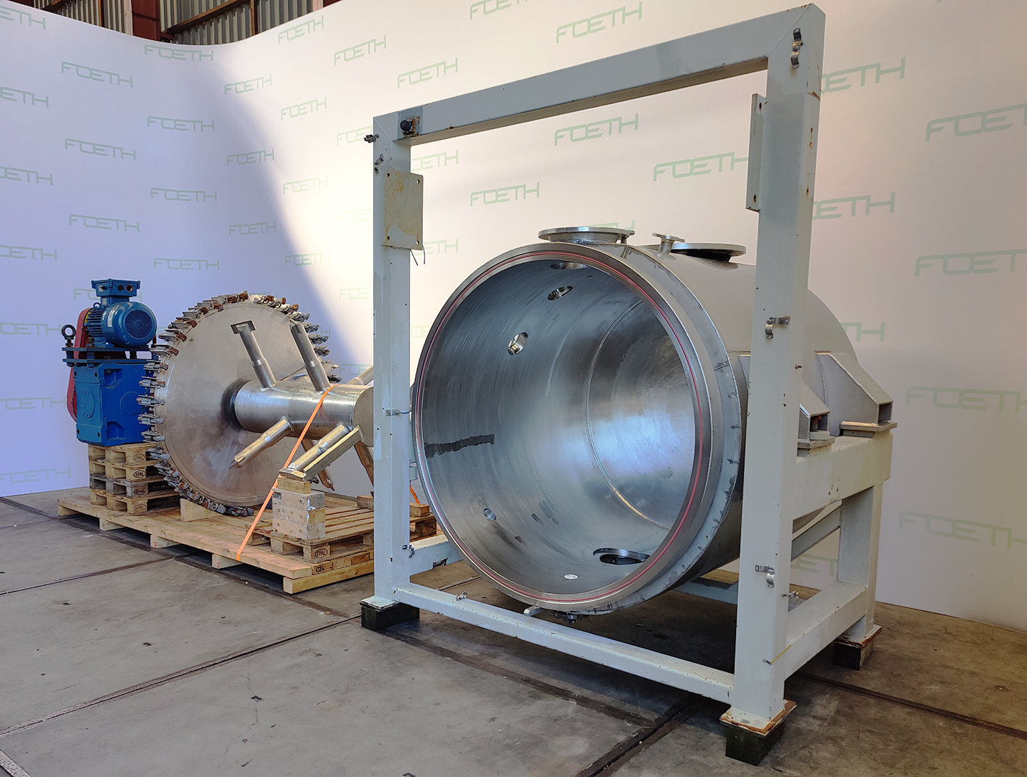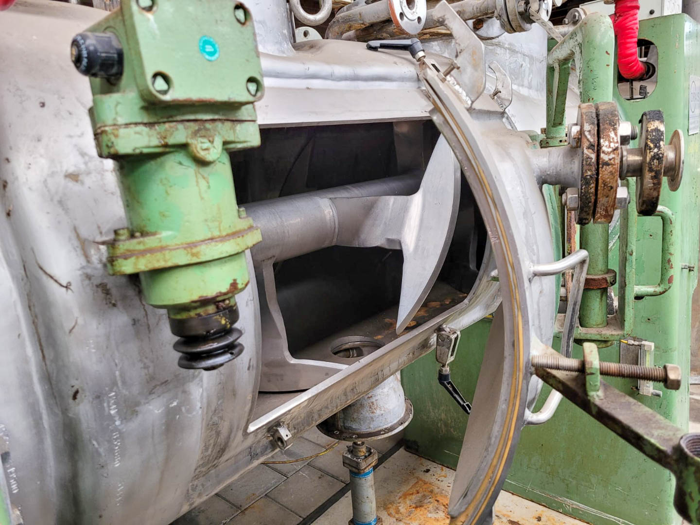 General SKU116S444 MakeHaagen & Rinau TypeHRT-4000 No.8894086, Vessel 44852/1 Year of construction1990 Mounted on framecheck Pressure Working pressure6 Bar Vacuum possiblecheck Working pressure jacket6 Bar Main Features MaterialStainless steel Volume4660 Ltr. Motor55 KW Specified Features - Paddle dryer Paddle dryer(1x) Capacity4660 Ltr. Trough sizesdia. 1450x3350 mm Manholedia. 500 mm With jacket(300 Ltr.) Shaft can be heated(420 Ltr.) Max. temperature250 °C With mechanical sealcheck Motor55 kW, 167-500 Volt Speed mixing shaft1,89-5,68 rpm MaterialStainless steel 1.4571 (316Ti) Information LocationBarneveld Floorspace6,5x1,8 m Total height2,7 m Weight± 16.500 kg (incl. drive unit)Catalysts & fillersFeed additivesDiscountPowdered foodsGeneric medicinesOther pharmaceuticsOintmentsCosmeticsSugarFine chemicalsStarchAnimal feedOther chemicalOther feedConfect ...