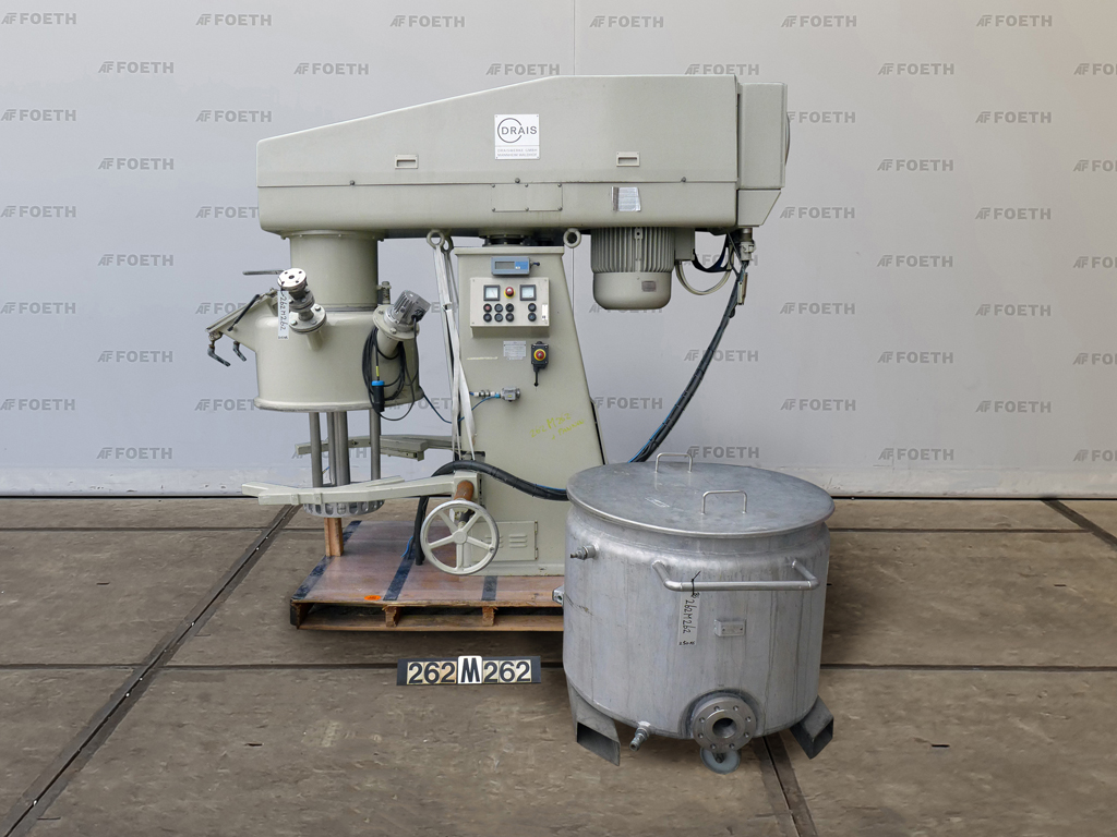 General SKU262M262 LocationBarneveld MakeDraiswerke GmbH Mannheim TypeRN 2-24 No.52780 Material Pan materialStainless steel Pressure Working pressure0 Bar Vacuum possiblecheck Main Features MaterialStainless steel Volume300 Ltr. Motor24 KW Specified Features - Dissolver MaterialStainless steel Dissolver/Homogenising vacuum mixer (1x) Shaft length± 900mm Disc diameterdia. 400mm With covercheck Motor24,0 KW, 380 Volt (Ex) With panscheck Capacity± 300 Ltr Pan sizesdia. 790x600mm Outletdia. 65mm With jacketcheck With hydraulic liftingcheck Information Year of construction1986 Mounted on wheelscheck With switchcheck Floorspace2,8x1,5 M Total height2,4 M Weight2400 KG ATEX compatiblecheckOils & fatCatalysts & fillersSolventsPaints & coatingsDetergent & surf.Other pharmaceuticsOintmentsLubricants & oleoFine chemicalsOther chemicalOther feedDyes & pigmentsMi ...