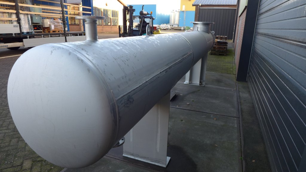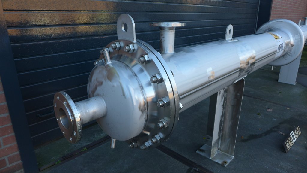 General SKU309N504 MakeFalk Gmbh&Co KG No.24320 Year of construction2007 Mounted on legscheck Material Shell materialStainless steel 1.4571 (316Ti) Tube materialStainless steel 1.4571 (316Ti) Pressure Working pressure shell0.49 Bar Working pressure tubes6 Bar Main Features Shell (Material)Stainless steel Tube (Material)Stainless steel Surface25 m2 Specified Features - Shell and tube heat exchanger Heat exchangercheck Horizontalcheck Notified bodyAD2000 Heating surface25m2 Tube capacity140 Ltr Number of tubes:64 Tube diameter25,4mm Tube length5000mm Wall thickness tubes1,6mm Max. temperature60 degr.C. Shell capacity317 Ltr Shell diameter356mm Shell length5000mm Max. temperature100 degr.C. Shell connectionsdn65 Cover connections(2x)dn80 Information LocationBarneveld Floorspace5,7x0,7 M Total height1,0 M Weight800 KGTea, herbs & coffeeFine chemicalsStar ...