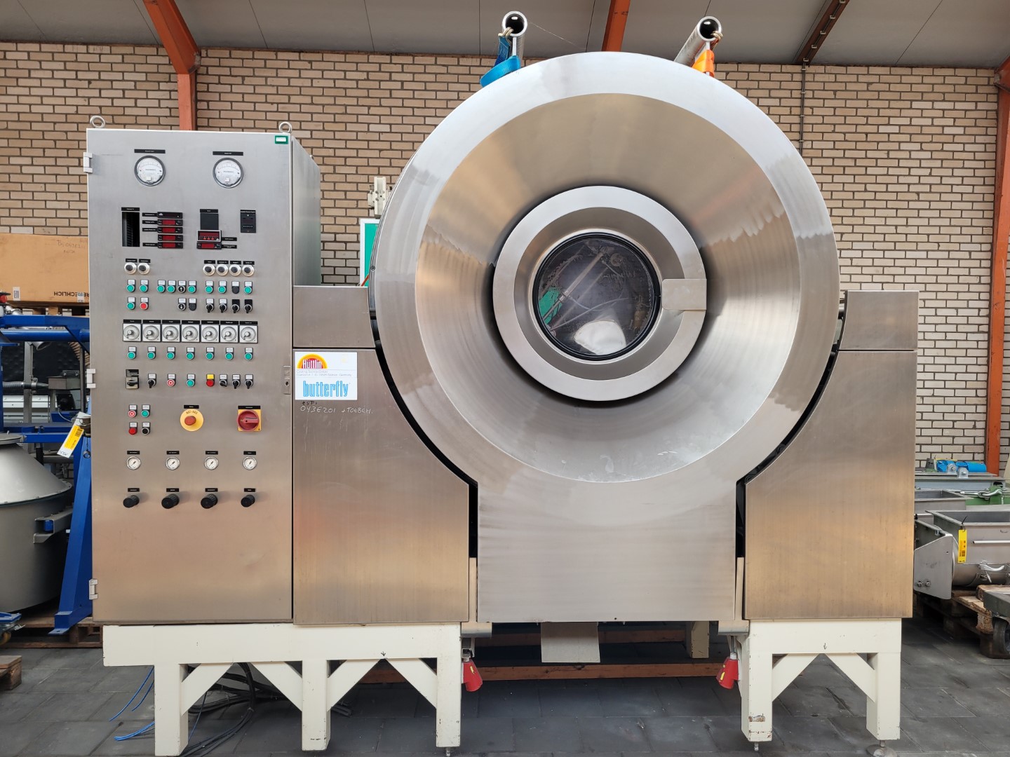 General SKU043E201 MakeHüttlin Coating-Technik GmbH Steinen TypeButterfly HB-750 No.HUE-100794 Year of construction1994 Mounted on framecheck Main Features MaterialStainless steel Motor7.5 KW Inlet diameter2070 mm Specified Features - Coating pan MaterialStainless steel 1.4301 (304) Coating installationFilm coating line (1x) Batch size200-600 KG Pan diameter2070mm Pan depth1560mm In-/Outletdia. 700mm Motor± 9,2 KW, 400 Volt With frequency controllercheck Pan speed± 1,5-15 Rpm With electric heatingcheck (210 KW) With fancheck (2x) Motor7,5 KW, 380 Volt + 15,0 KW, 400/690 Volt With air filtercheck (2x) DCE Unimaster, Type UMA-454 V With spraying armcheck With dosing pumpcheck make Walther Trowal Information LocationBarneveld With switchgearcheck Floorspace3,7x2,3 m Total height3,2 m Weight5000 kgCoating pansDiscountHuettlinCoating pans > Coating pansDisc ...