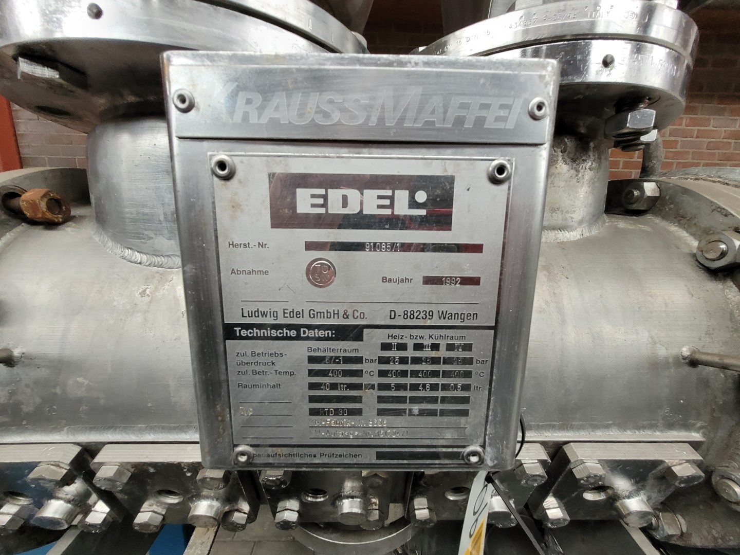 General SKU404U1227 MakeLudwig Edel LocationBarneveld Pressure Working pressure2 Bar Vacuum possiblecheck Working pressure jacket6 Bar Main Features MaterialStainless steel Volume5400 Ltr. Motor3 KW Vacuumcheck Specified Features - Stainless Steel Reactor MaterialStainless steel 1.4571 (316Ti) Stainless Steel Reactors ReactorBioreactor Capacity5400 Ltr. (max. 7350 Ltr.) Vessel sizesdia. 1800x3250 mm Dished bottomcheck Dished top sidecheck ManholeDN450 Top connectionsDN100 OutletDN50 With jacketcheck (73 Ltr.) Half coil jacketedcheck With paddle stirrercheck(double) Motor3 kW, 380/660Volt, 1400/90rpm Speed mixing shaft90 rpm Information No.85 239/1 Year of construction1986 Floorspace2x2 m Total height3,25 m Weight1600 kgFine chemicalsOther chemicalRubberBiotechnologyAgrochemicalsPlastic & polymersCatalysts & fillersPaper & otherSolventsDetergent & surf.O ...