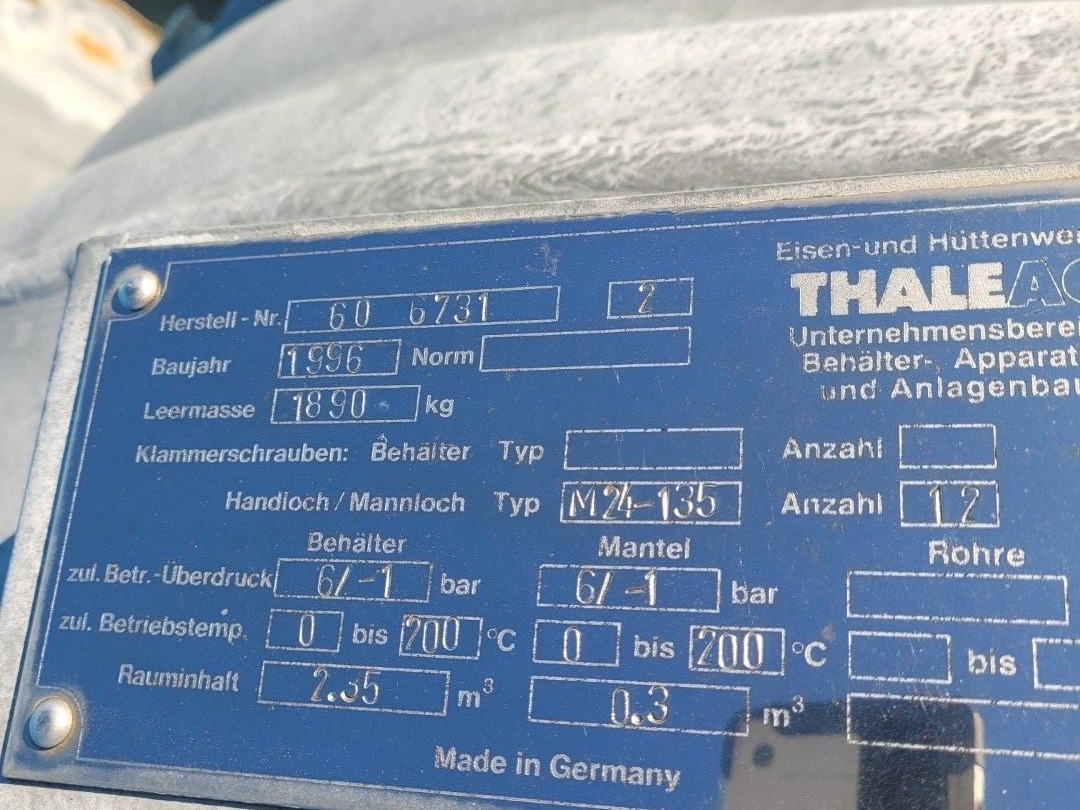 General SKU082C465 MakeEisen- und Hüttenwerke Thale AG No.60 6731 Year of construction1996 LocationBarneveld Material Lining materialGlass - Enamel Pressure Working pressure6 Bar Vacuum possiblecheck Working pressure jacket6 Bar Vacuum possible jacketcheck Number of vertical pressure tanks1 Main Features MaterialGlass Volume2350 Ltr. Pressure6 Bar Vacuumcheck Specified Features - Pressure vessel Capacity2350 Ltr Vessel sizesdia. 1400x1200mm Dished topcheck Dished bottomcheck Manholedia. 500mm Top connections(5x) Outletdia. 80mm Max. temperature200 Degr. C. With jacket(300 Ltr) Information Floorspace1,6x1,6 M Total height2,5 M -- VESSEL HAS NEVER BEEN USED -- Weight2150 KGPressure vesselsDiscountThaleTanks > Pressure vesselsDiscountBrand > Thale What you can expect from Foeth: -- Machine is in working condition -- At a reduced price compared to new -- Rea ...