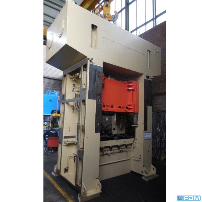 pressure:200 t distance between columns:1800 mm stroke:710 mm Distance table/ram, max. stroke up, adjustment up:1100 mm table surface area:1600 x 1300 mm pressure of drawing cushion in table:80 t stroke of drawing cushion in table:250 mm die cushion area:1400 x 1080 mm table height over floor:800 mm side window:1300 mm ram surface:1660 x 1300 mm speed down:400 mm/s speed up:410 mm/s working speed:14,3 - 49,7 mm/s power requirement:46,0 kW weight:25,0 t Dimensions (WxDxH):3,65 x 3,3 x 5,4 m height over floor:5,05 m height beneath floor:0,4 m German Safety: permitted for manual loading:UVV 11.064 - VBG 7n5.2 light guard at front and back:Sick drawing cushion in table:hydraulic ejector in ram:hydraulic depth stop:mechanical