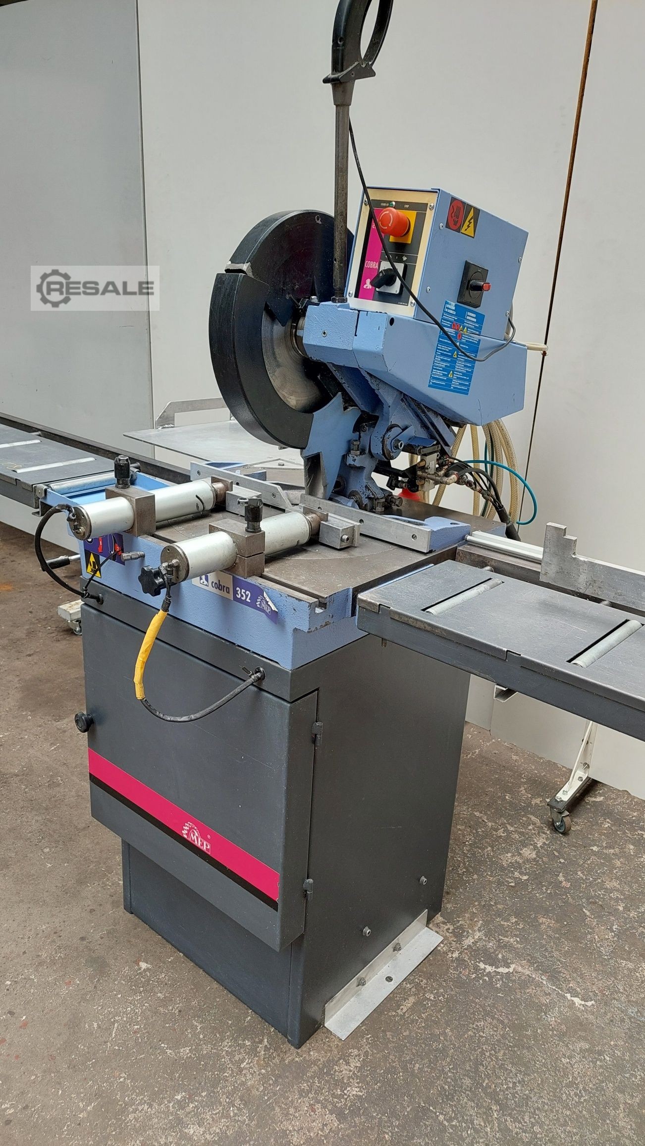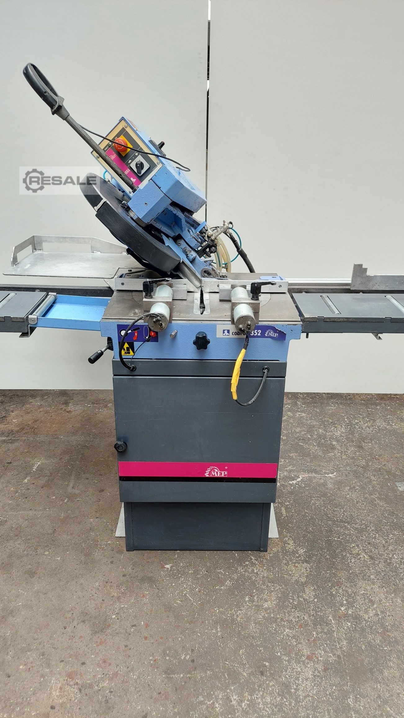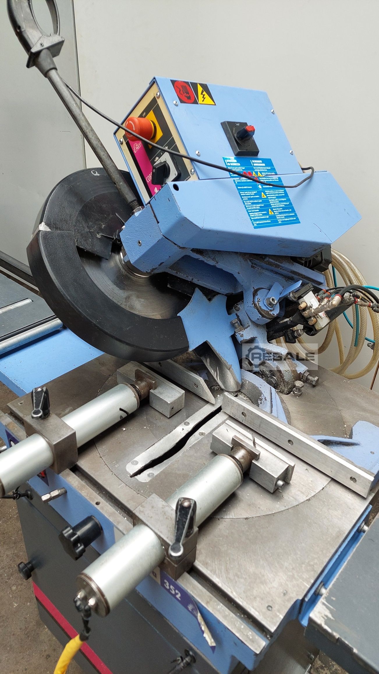 COBRA 352 SX evo, machine de sciage électropneumatique semi-automatique pour couper l’aluminium et les alliages légers à l’aide d’une lame avec plaques de métallisation électroweldées (HM). La machine coupe de 45 à droite à 45 gauche et la tête s’incline de 0 à 45 gauche afin de faire des coupes inclinées. Machine de sciage avec microprocesseur à axe unique contrôlé avec la dernière génération de contrôleurs pour les machines semi-automatiques de sciage conçues par le MEP. OPÉRATION : Démarrer le cycle au moyen du bouton-poussoir relatif les étapes suivantes sont effectuées : – le vice se ferme et le moteur démarre – la tête descend pour exécuter la coupe – arrêts moteurs – la tête revient à la position supérieure et le vice s’ouvre. MEILLEURS PRIX EN EUROPE POUR LES MACHINES MEP! DEMANDEZ UN DEVIS!!
