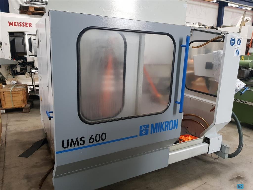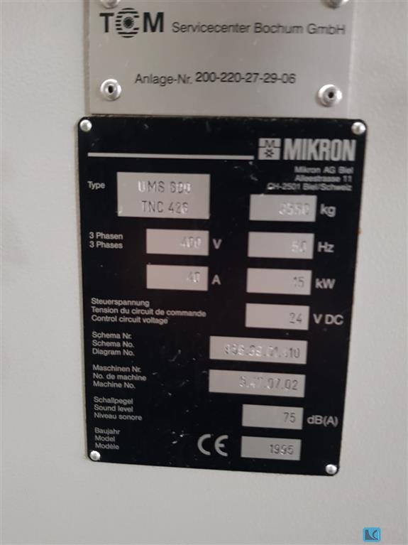 x-travel: 600 mm y-travel: 500 mm z-travel: 450 mm Control: Heidenhain TNC 426 PB tool change unit: 22-fach tool taper: SK40 turning speeds: 5-6.300 U/min table-size: 900 x 530 mm table load: 400 kg total power requirement: 9 kW weight of the machine ca.: 3550 kg dimensions of the machine ca.: 2,2 x 2,7 x 2,05 m 3-axis vertical machining centre MIKRON UM 600, built in 1997 In excellent technical condition, all guides have been freshly scraped. The spindle has been re-mounted and has since been used for only 262 hours. New power unit for spindle drive installed. Accessories: Heidenhain TS 642 touch probe system 2 new vices SK40 tool holder The data for this ad was created with ModulMWS - the software solution of LogoTech oHG.