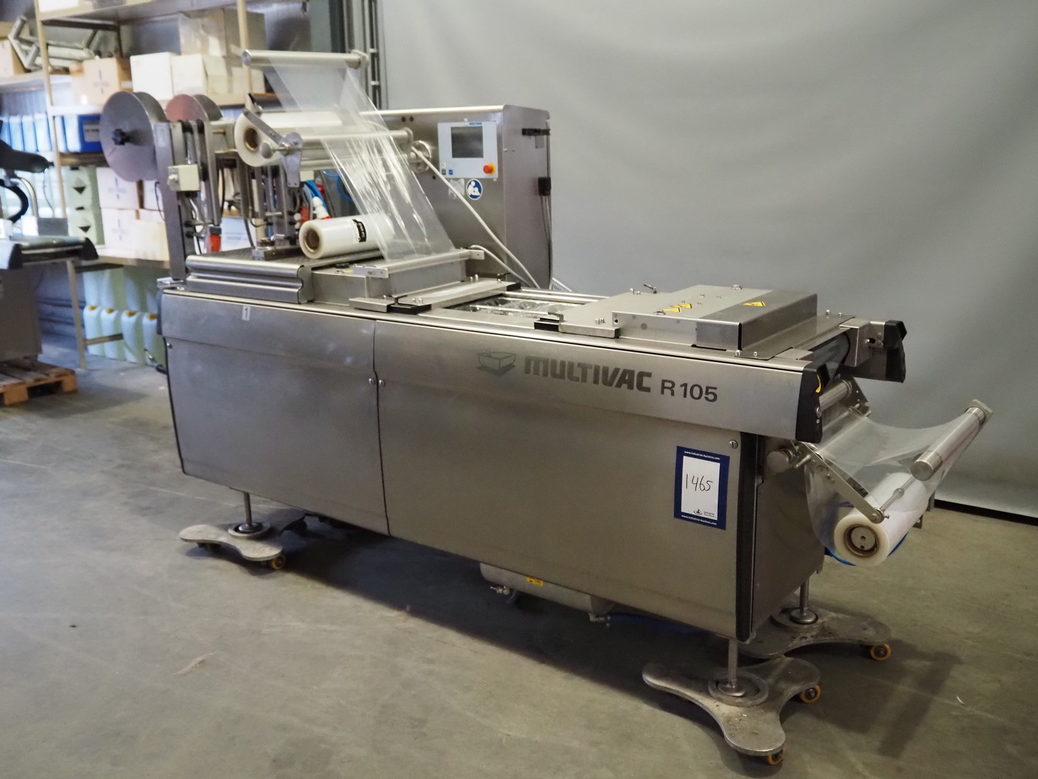 Multivac thermoformer, type: R105, machine number: 128554, year of construction: 2009, 400 V, 3 Ph, 50 Hz, 24 A, 8 kW, film width: 360 mm, dye: (4x) 145 mm x 100 mm, plastic mesh outfeed belt, belt width: 315 mm, Busch vacuum pump, type: RA 0100 E 5Z1, capacity: 100 m³ per hour, total dimensions: 3320 mm x 1000 mm x 1850 mm. Including crate with extra parts.