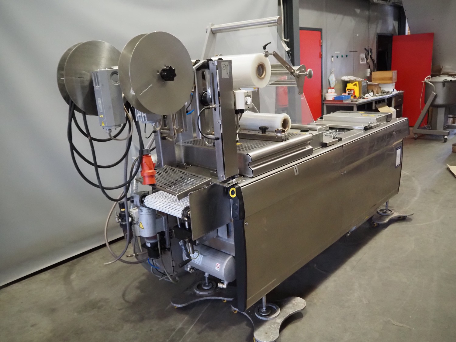 Multivac R 530 , 硬膜 + 软膜 , 膜宽 420 mm , 打印 560 mm , 格式 2.3 , MAP 熏蒸 , 长插入区域 , 用于底膜的巨型卷筒支架 , 用于顶部膜的双箔支架 , 打印标记控制 , 3 x 软膜横切 , 3 x 硬箔冲