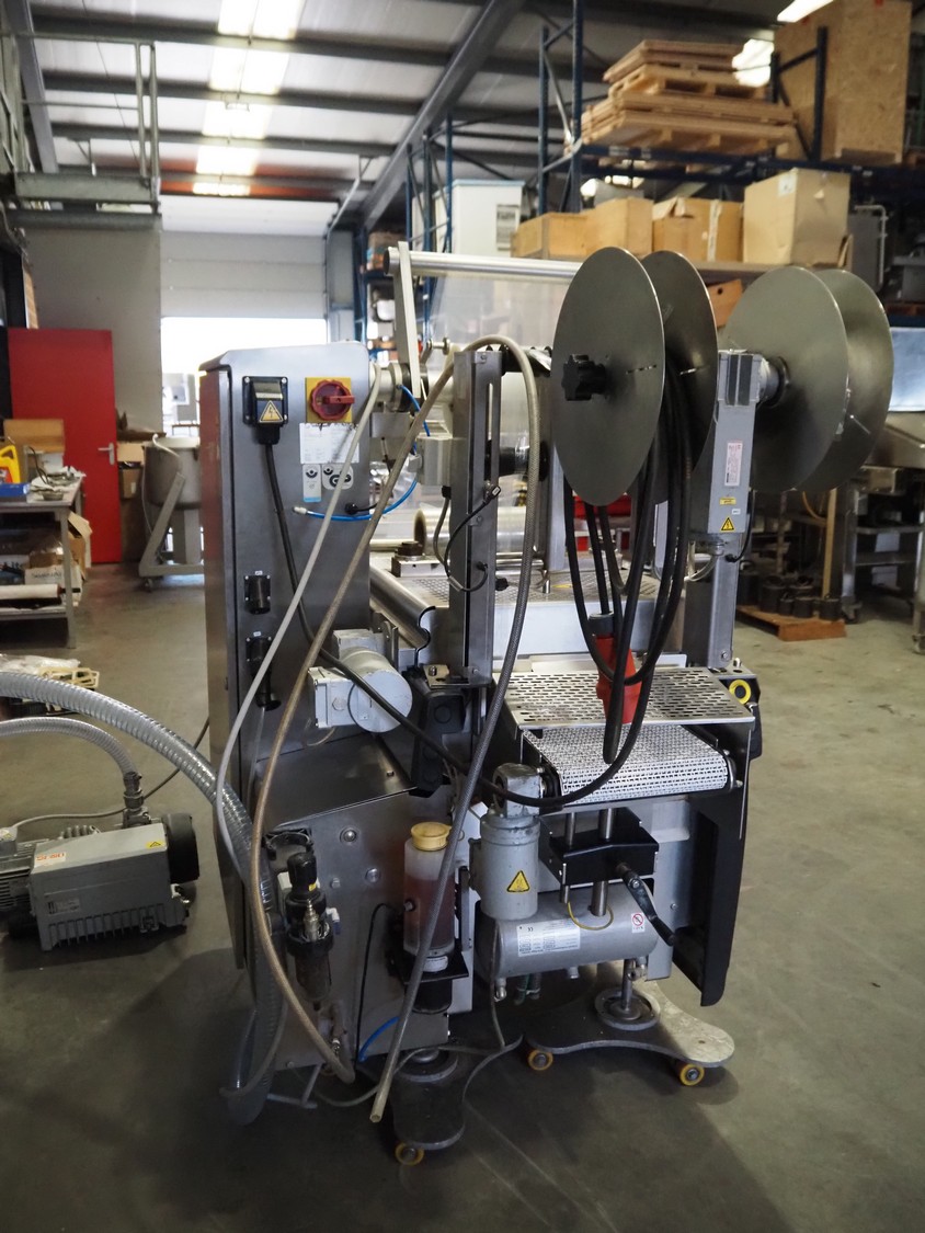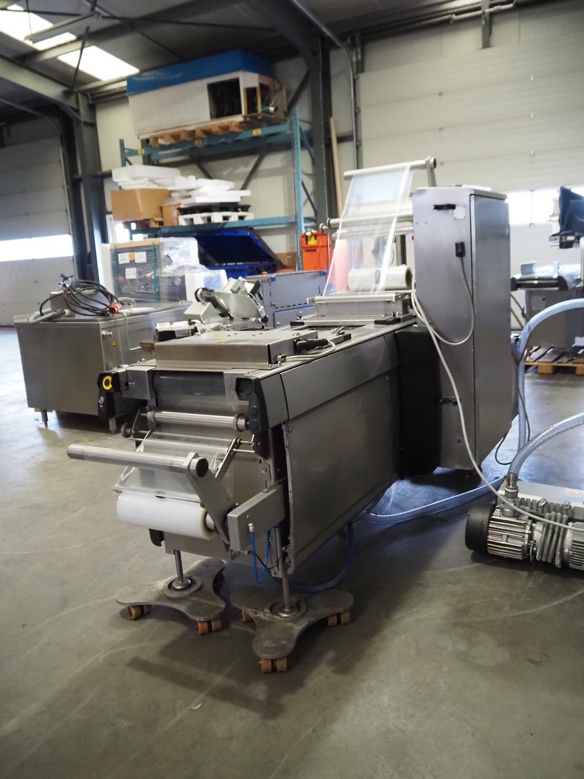 Multivac 托盘封口机 T 700 用于鲜肉 带氧气 长度:4.9 米。 控制工控机 05 双联真空泵:600 cbm/h 壳体/工具: 190x144,深 75 毫米 227x178,深 50 毫米 价格包括: 1 x Carsoe 输送带 L 5 mtr。 带 2 个卸垛头