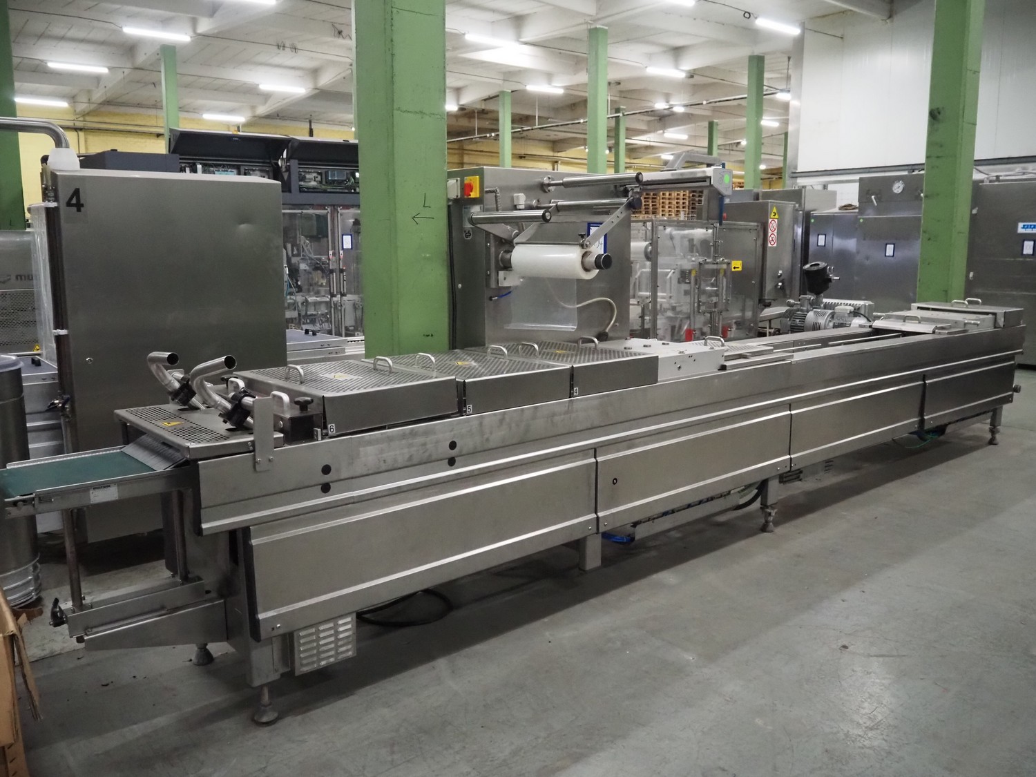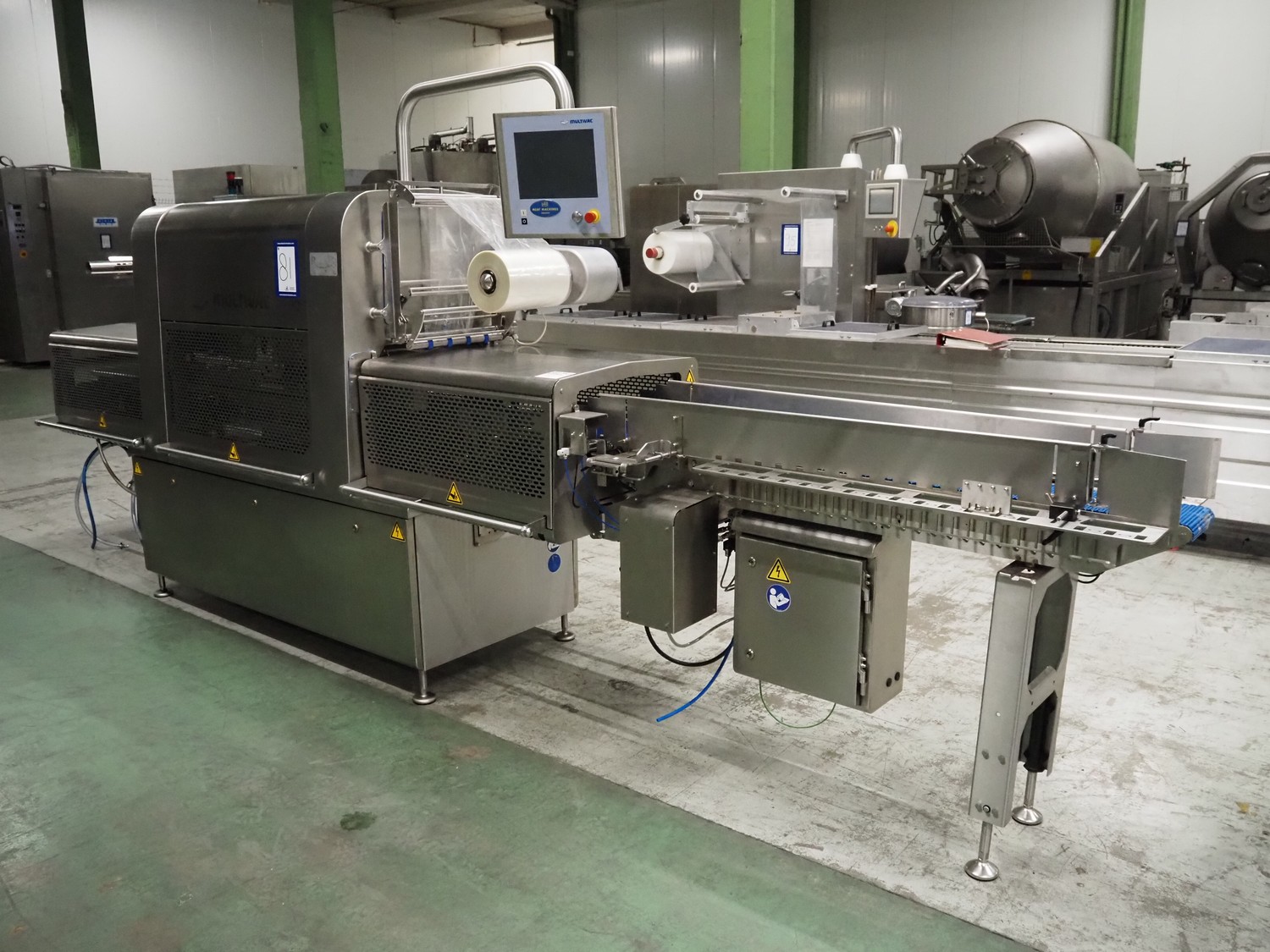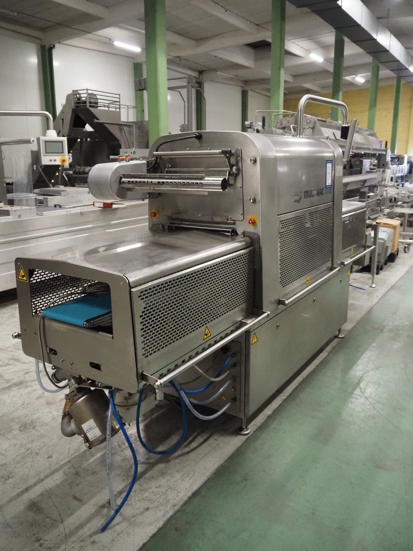 Dostępna jest tacowa maszyna pakująca Multivac wraz z pomocniczą maszyną pakującą MCS 260. Wymiary tacki X/Y 1: 187mm/137mm, szerokość filmu 1: 335mm, wymiary tacki X/Y 2: 340mm/128mm, szerokość filmu 2: 315mm, maksymalna szybkość cyklu: 15 cykli/min, przepustowość: ok. 45 tacek/min, maksymalna głębokość tacki: 130mm. Wymiary maszyny X/Y/Z: ok. 4500mm/1050mm/2100mm, waga: ok. 1700kg. Dokumentacja dostępna. Możliwe jest przeprowadzenie inspekcji na miejscu.