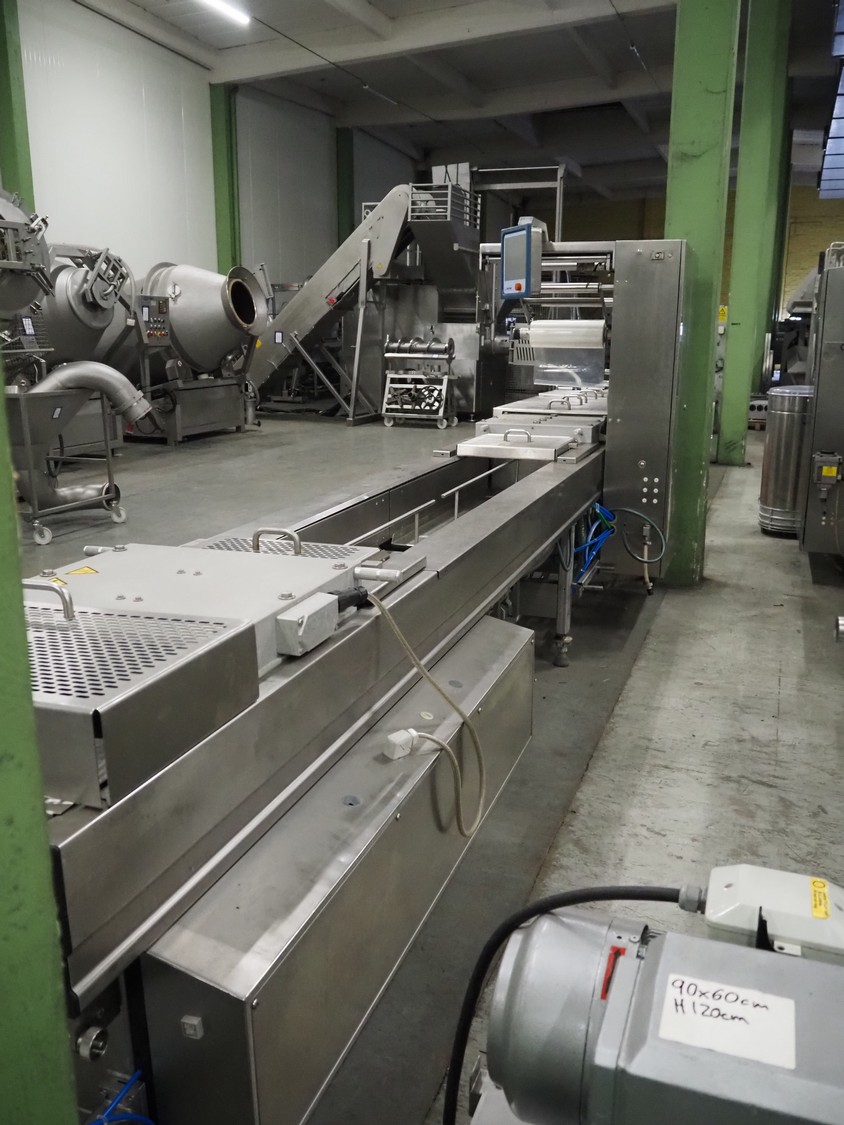 Output: max. 80 packs/minute, designed for square cups (101 x 101 x 57 mm),, two lanes,, consisting of the following individual machines:, shell destacking, make Carsoe Anytray Twin Denester, year of construction 2013, volume dosing filler, manufactured by Lieder/Robot Food Technologies, series AWF, type 2, year of construction 2015, for free-flowing, non-sticky products that contain little liquid., min. 15 pieces of product must make up the volume to be filled The machine is designed for processing e.g. vegetable mixtures, rice, pasta, caviar, olives, etc., With lifting and tipping device and corresponding housing, without dispenser for liquid or pastes, self-made, Time-controlled pump for dosing oil, brine or pasty products such as dips or dressings, two filling stations,, tray sealing line, make Multivac type T700, year of construction 2012, Sealing of prefabricated trays, bowls and c ...