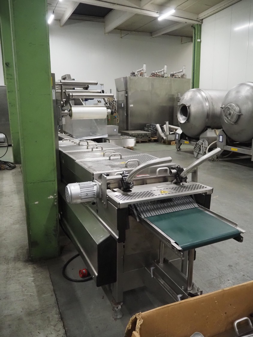Typ: MUTIVAC R 530 Typ folii: elastyczny Szerokość dolnej folii: 625 mm Szerokość górnej folii: 610 mm Długość odcięcia: 657 mm Wielkości opakowań: 2.1 (2 szt.: 640 x 267 mm) Maksymalna głębokość: 200 mm Pompa próżniowa: 250 m3/h Długość: 8500 mm