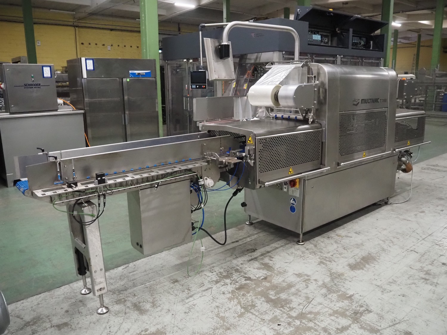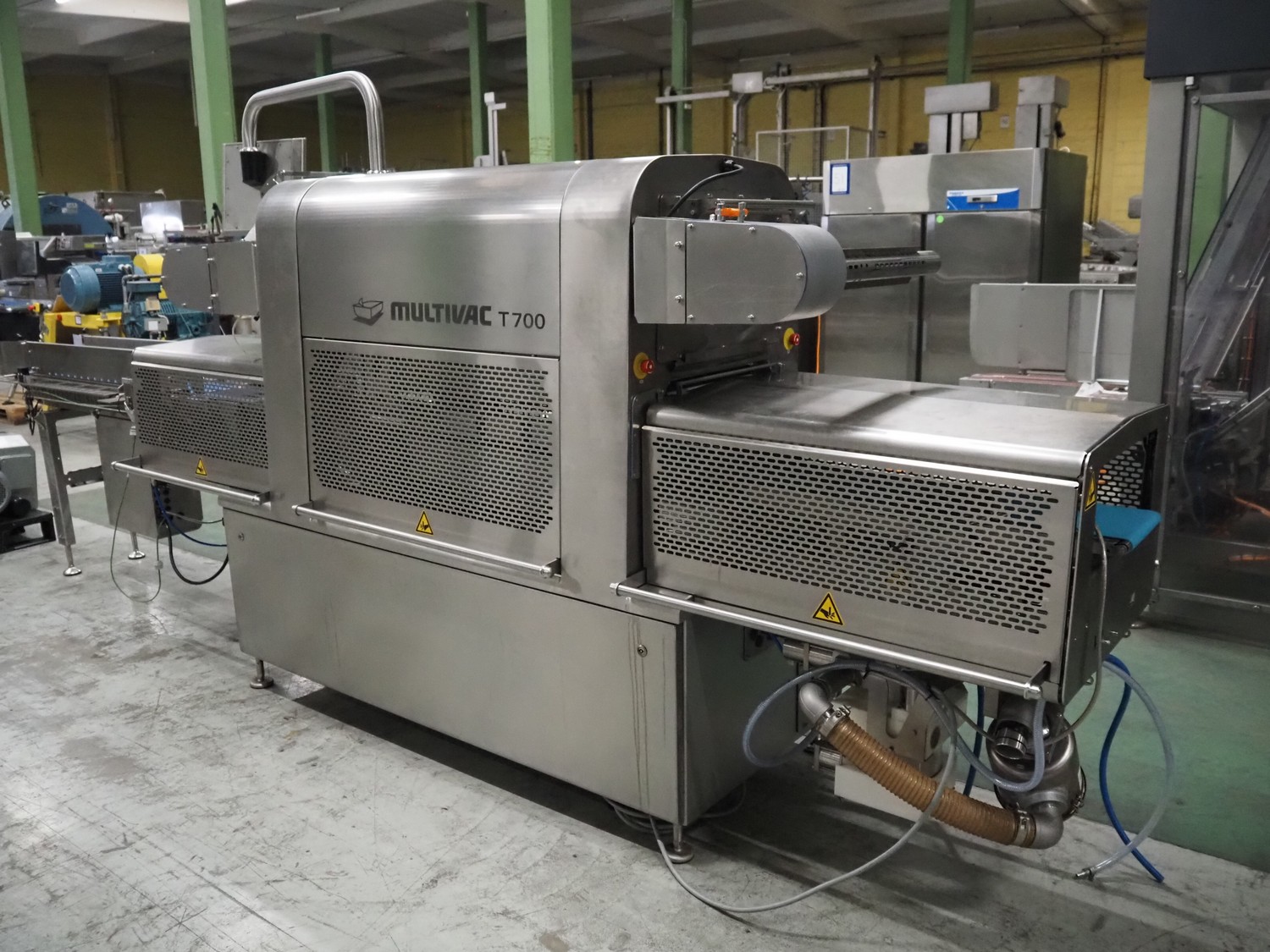 Multivac traysealer, type: T700, serial number: 169932, year of construction: 2013, 400/230 V, 3 Ph, 50 Hz, 18/32 A, 4.2 kW, film width: 280 mm, plastic mesh infeed belt, belt width: 200 mm, dye: (4x) 230 mm x 160 mm, plastic outfeed belt, belt width: 250 mm, total dimensions: 4850 mm x 850 mm x 2050 mm, Eurovacuum vacuum pump, type: EV-O175F, capacity: 175 m³ per hour, dimensions: 900 mm x 750 mm x 400 mm, s/s trolley for dye sets, dimensions: 1500 mm x 750 mm x 1350 mm, s/s frame with additional dye set, dimensions dye: (4x) 230 mm x 160 mm, dimensions frame: 2100 mm x 500 mm x 1250 mm, pallet with parts, 14 pallets with plastic trays, dimensions each tray: 230 mm x 140 mm x 35 mm.
