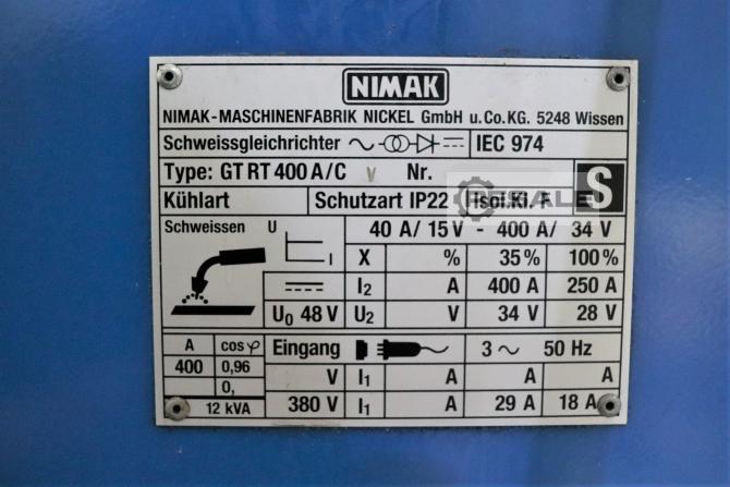 TIG welding machine, TIG welding machine NIMAK type GS 200 WWIG and electric DC welding machine, E-welding machine also for rod electrodesFabr. No. 26642 Year of construction approx. 1983Power 200 Amp. = 60% ED 150 Amp. = 100% EDEinfinitely variable power adjustment rangeMains connection 380 Volt, 50 Hz, 32 Amp. Plug- 5 meter TIG hose packet- HF ignition- stepless current control and current rise- connection for electrode welding- direct current only- water-cooled- inert gas pressure reducerSpace requirement L x W x H 900 x 590 x 1000