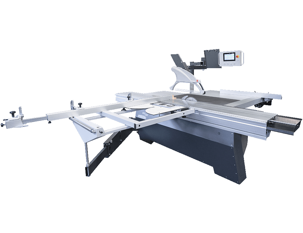 Sliding table saw Brand: Panhans Type: 680 100 New machine Technical data: Trolley length 3200 mm Cutting length 3400 mm Cutting height max. 155 mm at 90 ° 105 mm at 46 ° Cut width Width stop 1030 mm Saw blade max. Ø 450 mm Saw blade under table retractable Ø 400 mm Table size cast table top 1200 x 655 mm Table extension plus. 750 x 655 mm Table extension 1200 x 655 mm Table height +/- 20 mm 900 mm Main saw blade speed 3000/4000/5000/6000 rpm Net weight approx. 1051 kg Technical description: Solid German mechanical engineering For trimming, cutting to length, formatting, miter cutting, etc. Dimensionally stable and self-supporting machine body manufactured as a stable frame welded construction from thick-walled steel profiles, laser-processed sheet steel parts and mechanically processed The torsion-resistant and finely planed cast table top is built on the ...