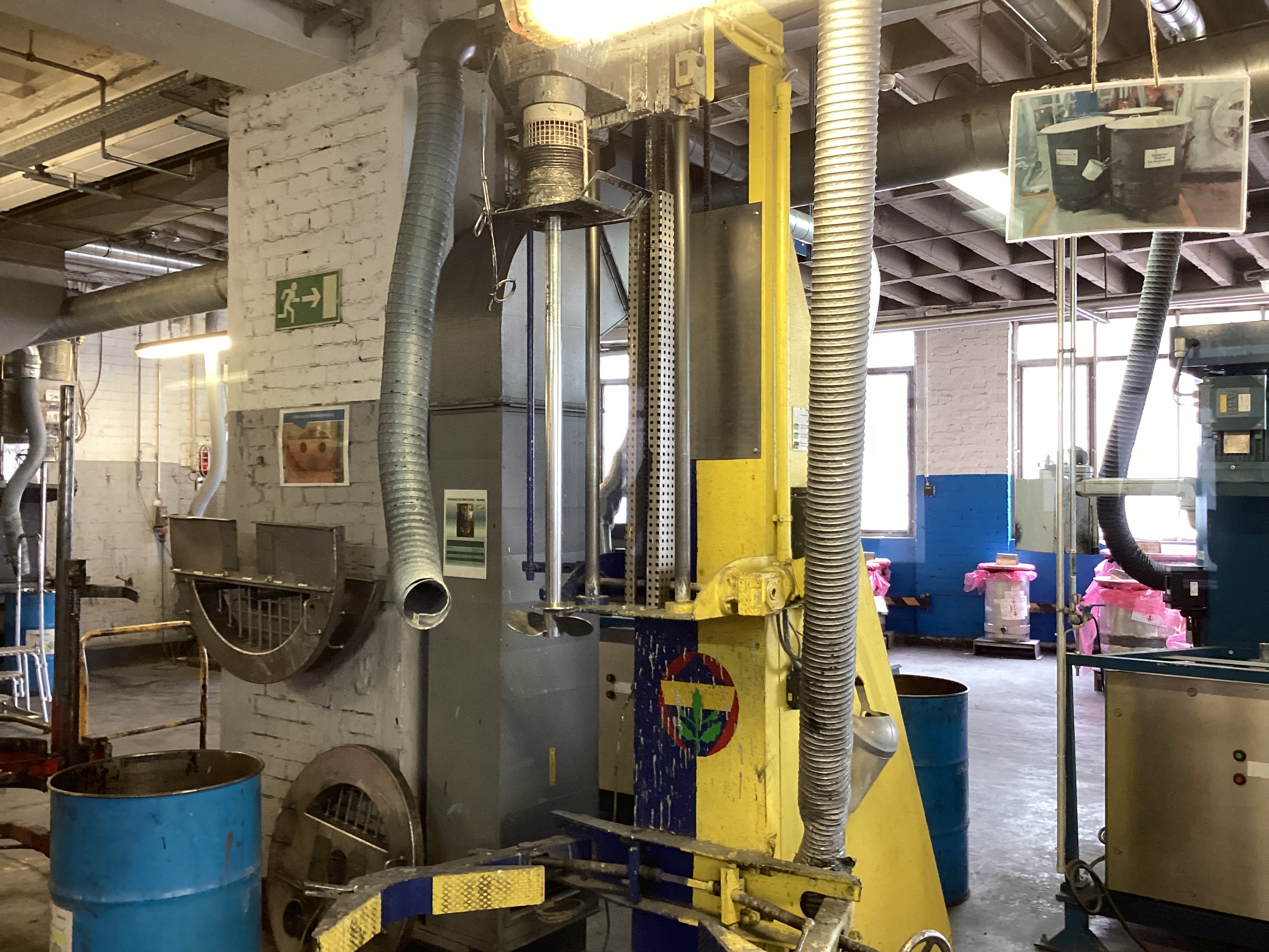 Dissoudeur à entraînement unique, de type poche fabriqué par PENDRAULIK, modèle : DWDV 10, pour fûts de 200 litres. Puissance d’entraînement principale (disque disperseur) : 5 kW, vitesse réglable. Capacité du baril : 200 litres.