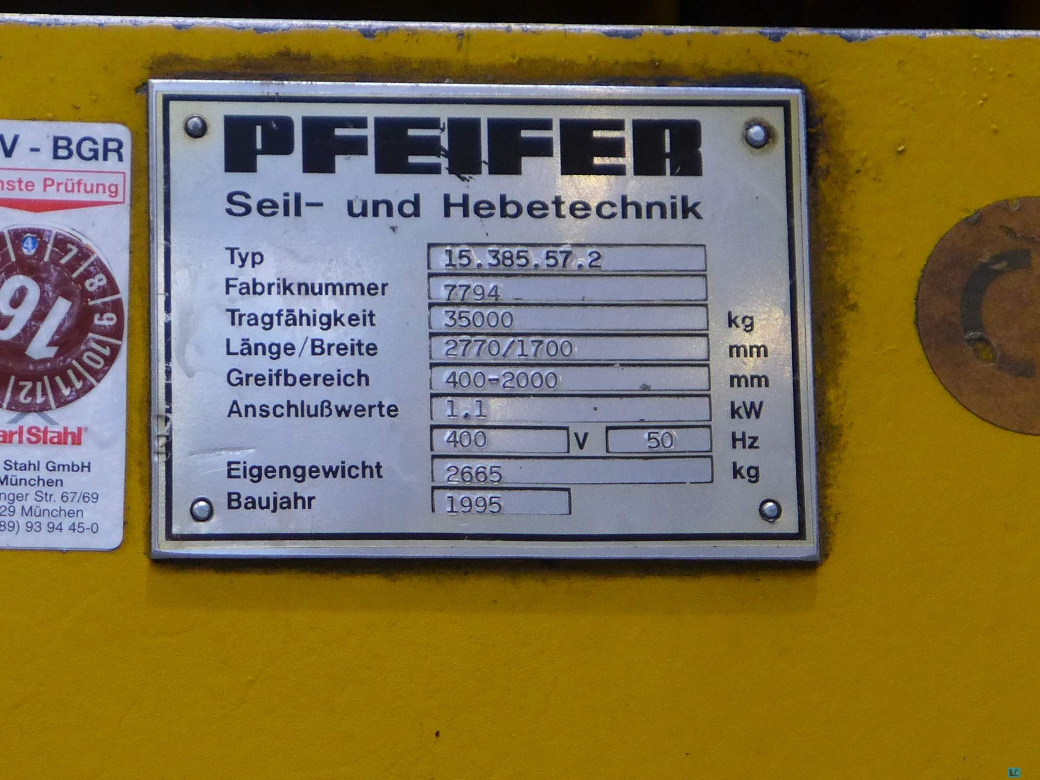 ESPECIFICAÇÕES TÉCNICAS Fabricante: PFEIFER Seil- und Hebetechnik GmbH Descrição: Viga transversal de dois guindastes, viga transversal de guindaste, viga transversal de tubo Tipo: 270092 Ano construção: 2015 Capacidade de carga: 40.000 kg peso: 3.150 kg Comprimento de trabalho/faixa de preensão: 1.920 - 7.250 mm COMENTÁRIO ESPECÍFICO - Pontos de ancoragem variáveis - Ideal para o transporte de segmentos de betão pesado - Última inspeção de acordo com BetrSichV 09/2023