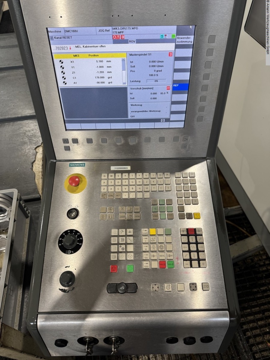 x-travel: 1250 mmy-travel: 1000 mmz-travel: 1000 mmspindle taper: HSK-A 100 turning speed range: 10.000 U/minspindle drive: 28 kWTorque: 1240 Nmfeed range: 0 - 12.000 mm/minrapid traverse: 60 m/mintable surface area: 800 x 1000 mmworkpiece weight: 1500 kgControl: Siemens 840D total power requirement: 80 kWweight of the machine ca.: 21 tdimensions of the machine ca.: 5,9 x 6,5 x 3,5 m5-axis simultaneous machine equipped with:- CNC control Siemens 840D- 6-fold pallet station- Tool changer (HSK 100)- Coolant system with IKZ 40/80bar- Probe- tool breakage controlThe data for this ad was created with ModulMWS - the software solution of LogoTech oHG.