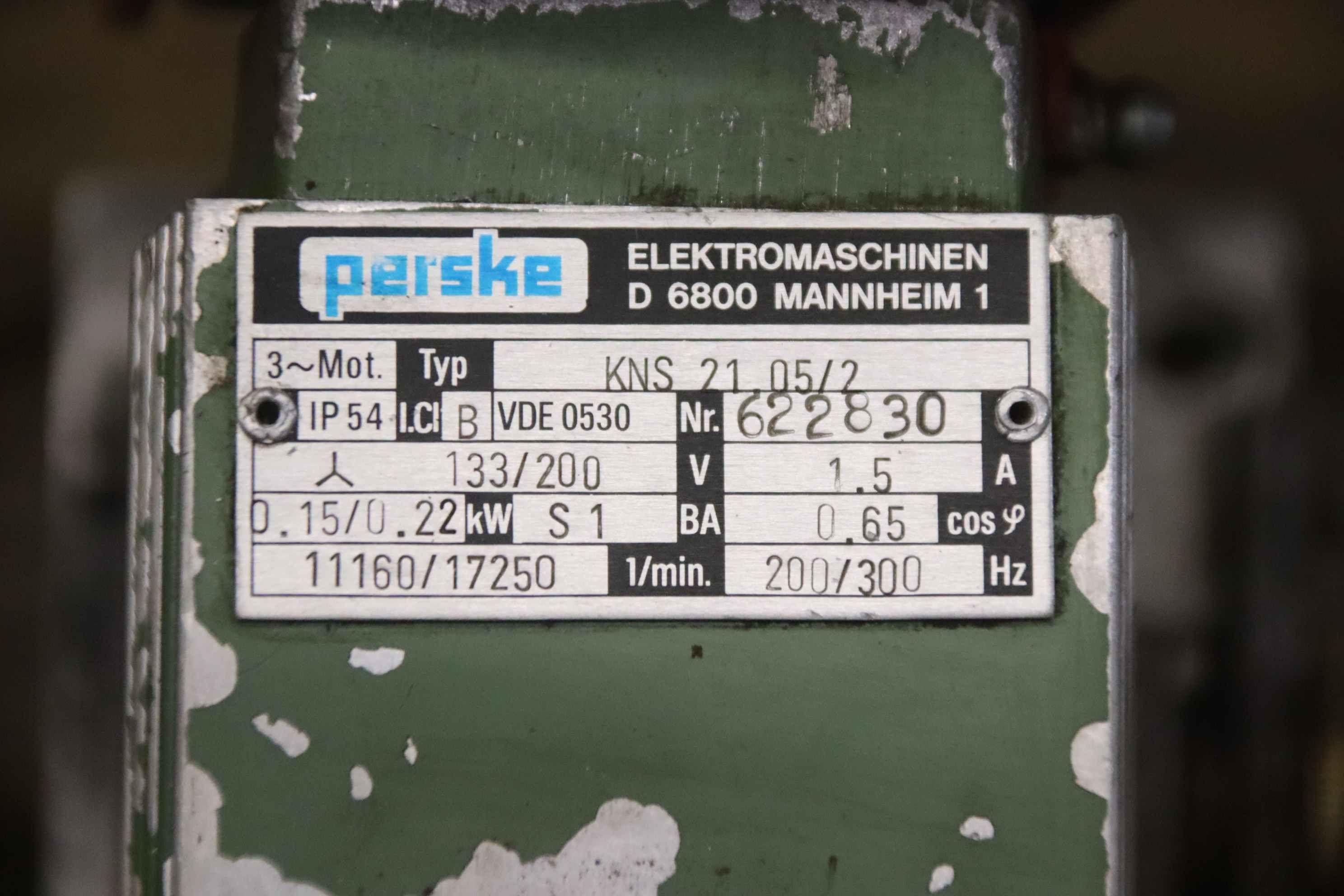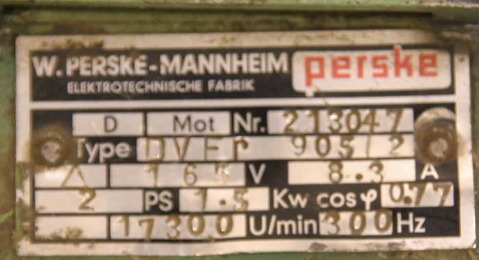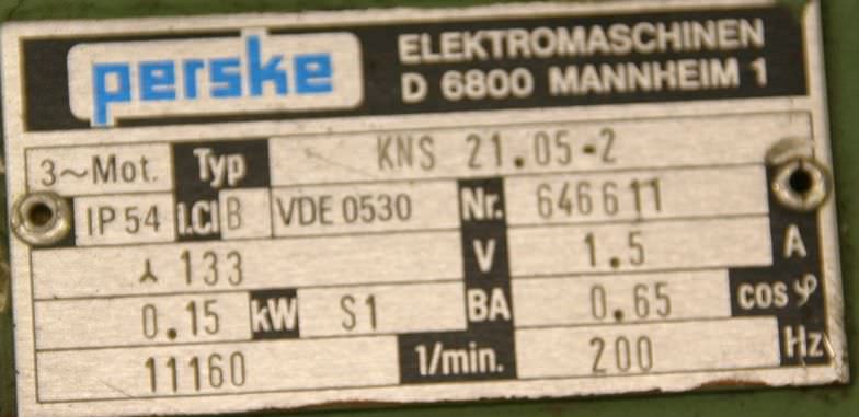 Double-end tenoner, edge processing machine, scoring motor, chipper motor, milling motor, spindle motor-Manufacturer: Perske, milling motor type KNS 21 05/2 with bracket-Power: 0.15/0.22 kW 11160/17250 rpm-Voltage: 133/200V / 200/300 Hz-Mounting shaft: Ø 15 x 15 mm-Saw blade. Ø 140 mm-Dimensions: 260/200/H200 mm-Weight: 4.5 kg.