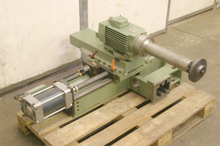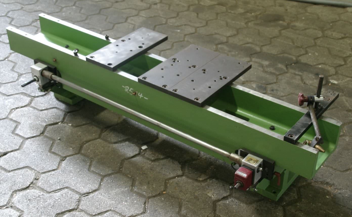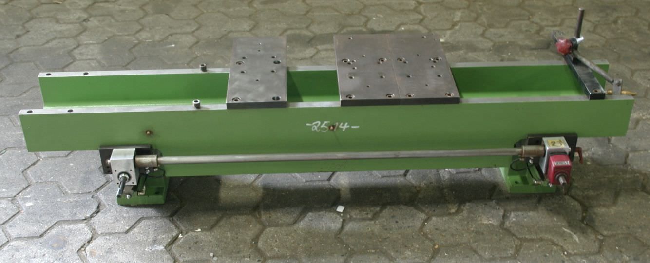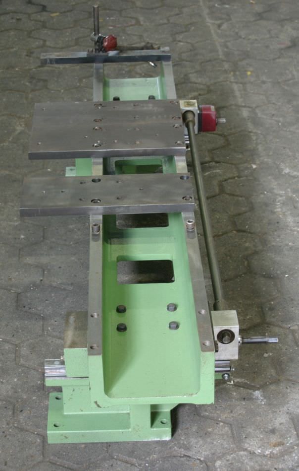 Unit carrier, clamping plate traversing table, for unit construction kit, format processing unit, cutting unit, milling unit, profile milling unit, jointing milling unit, trimming unit, double-end profiler, edge processing machine, scoring motor, chipper motor, milling motor for edge processing machine -HOMAG unit carrier for milling units -with heavy leadership -laterally movable -with counter -Table height: 361 mm -Table surface: 1545 x 300 mm -Table thickness: 20 mm -Dimensions: 1545/500/H361 mm -Weight: 222 kg
