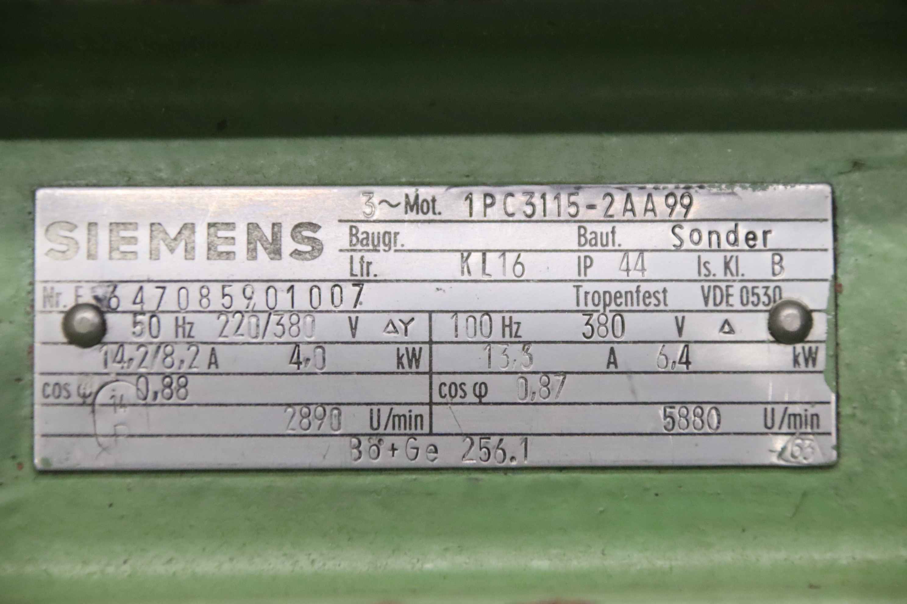 Double-end tenoner, edge processing machine, scoring motor, chipper motor, milling motor, spindle motor, electric motor-Manufacturer: Siemens, milling motor electric motor type 1PC3115-2AA99-Power: 50 Hz 4.0 kW 2890 rpm / 100 Hz 6.4 kW 5880 rpm-Voltage: 220/380 V-Mounting shaft: Ø 35 x 75 mm-Dimensions: 550/280/H195 mm-Weight: 60 kg