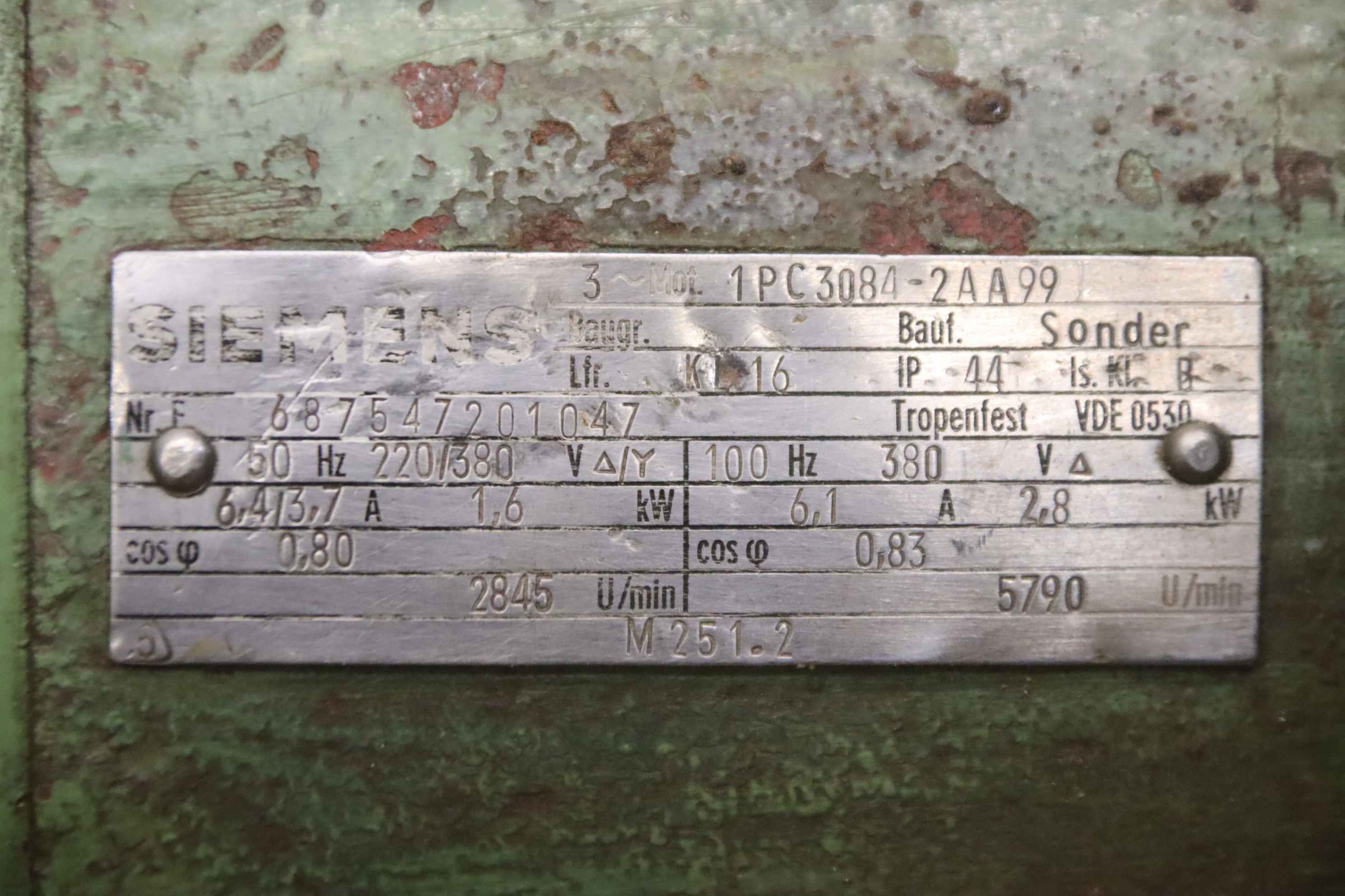 Double-end tenoner, edge processing machine, scoring motor, chipper motor, milling motor, spindle motor, electric motor-Manufacturer: Siemens, milling motor electric motor type 1PC3084-2AA99-Power: 50 Hz 1.6 kW 2845 rpm / 100 Hz 2.8 kW 5790 rpm-Voltage: 220/380 V-Mounting shaft: Ø 30 mm-Quick clamping system: Leuco with saw blade Ø 190 mm-Dimensions: 395/210/H200 mm-Weight: 25 kg