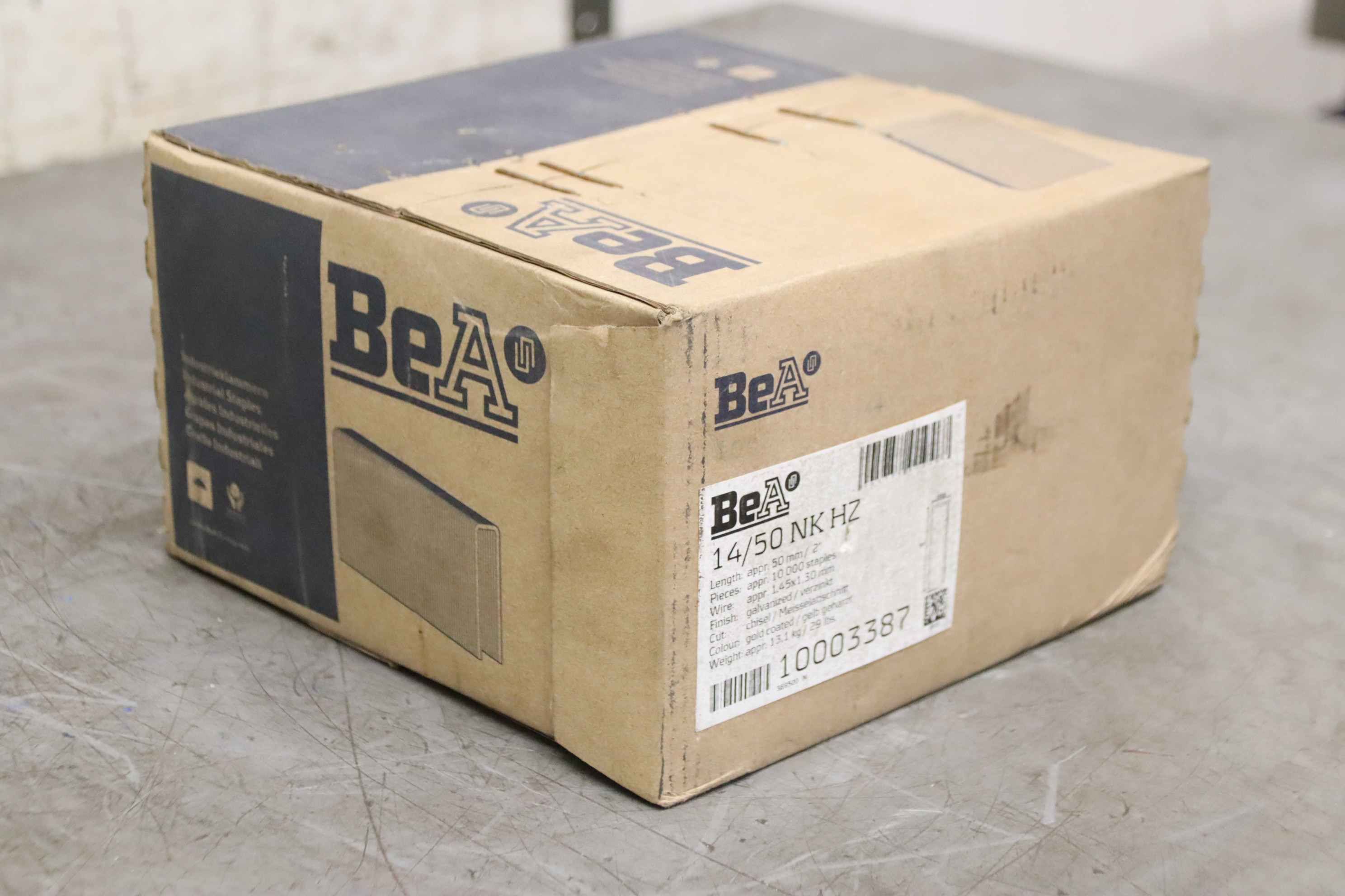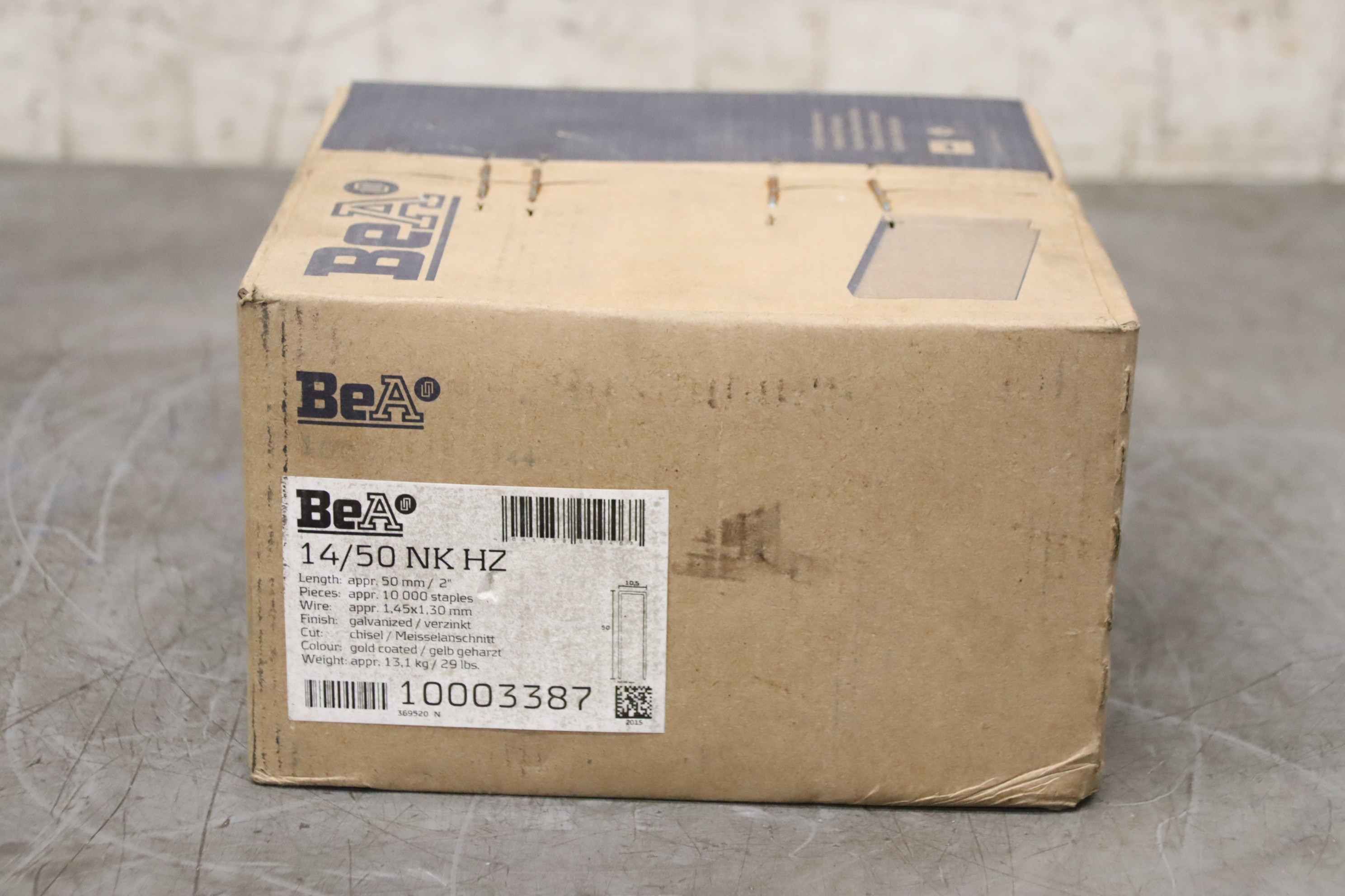 Staples, staples, industrial staples -Manufacturer:BeA -Name: Industrial staples -Type 14/50 NK HZ 10.000 pieces per box -Length: 50mm / 2 -Spine width: 10.5 mm -Material: galvanized steel -Color: yellow resin -Quantity: 4 pieces/cartons available -Price: per box -Transport dimensions: 210/210/H130 mm -Weight: 13 kg/carton