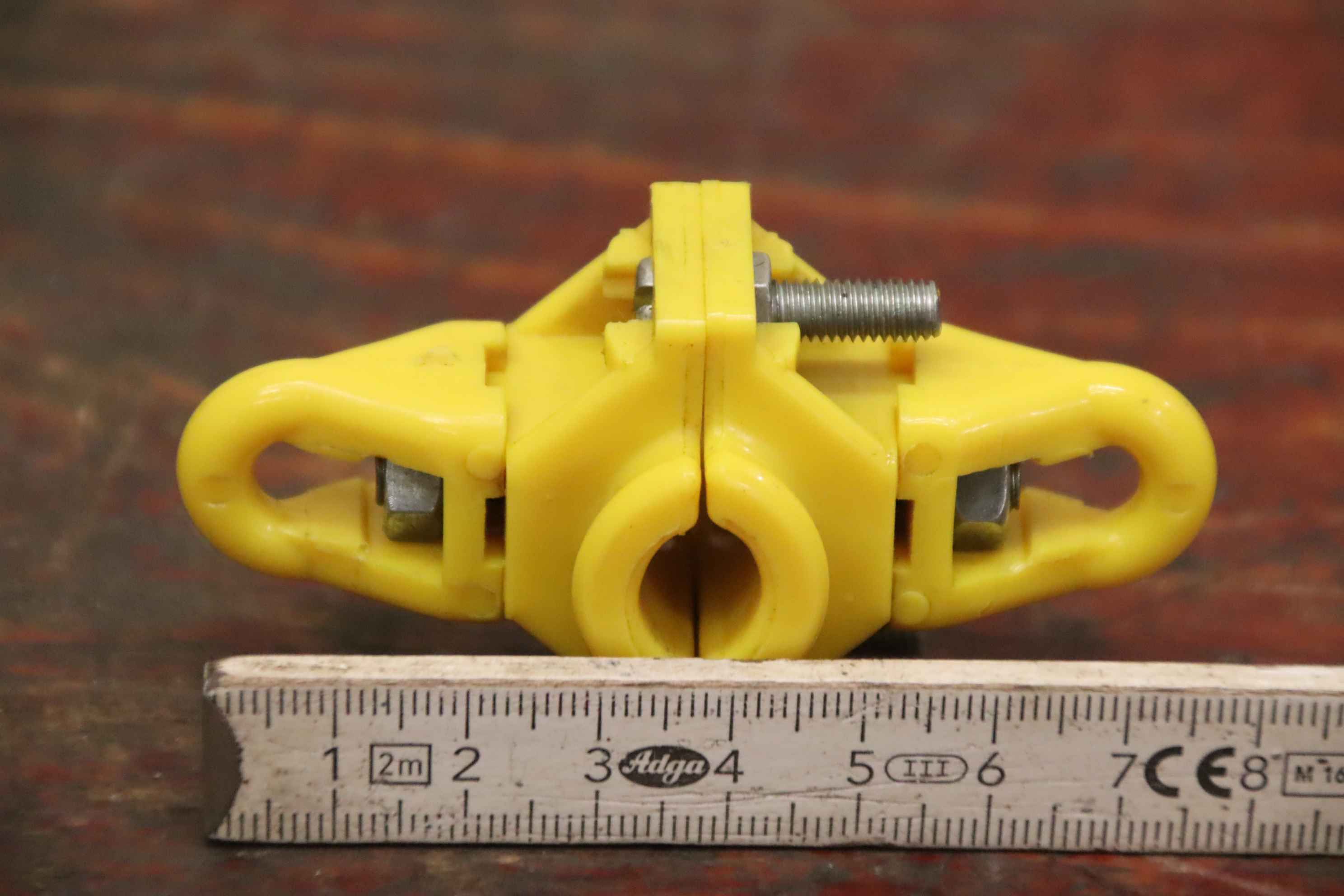 Suspension clamp, clamp sleeve, sliding gate sleeve, cable clamp, cable trolley, cable trolley component-Manufacturer: Lapp, cable clamp 9 pieces-Type: Round 26-36 mm-Shipping/Price: complete-Dimensions: 140/65/H60 mm-Weight: 0.1 kg/piece
