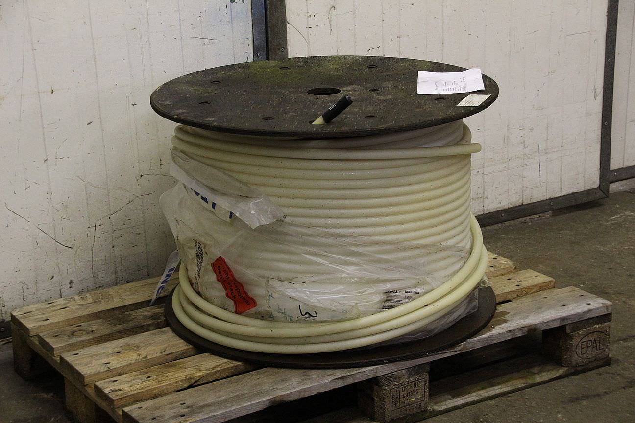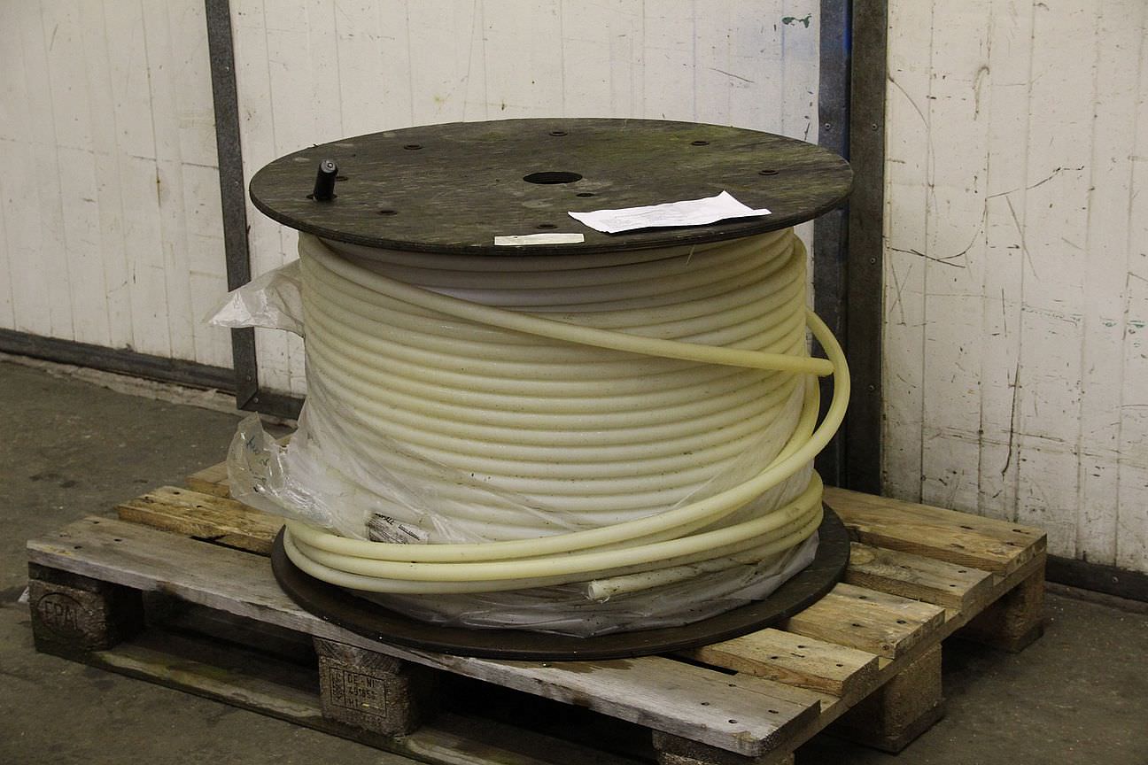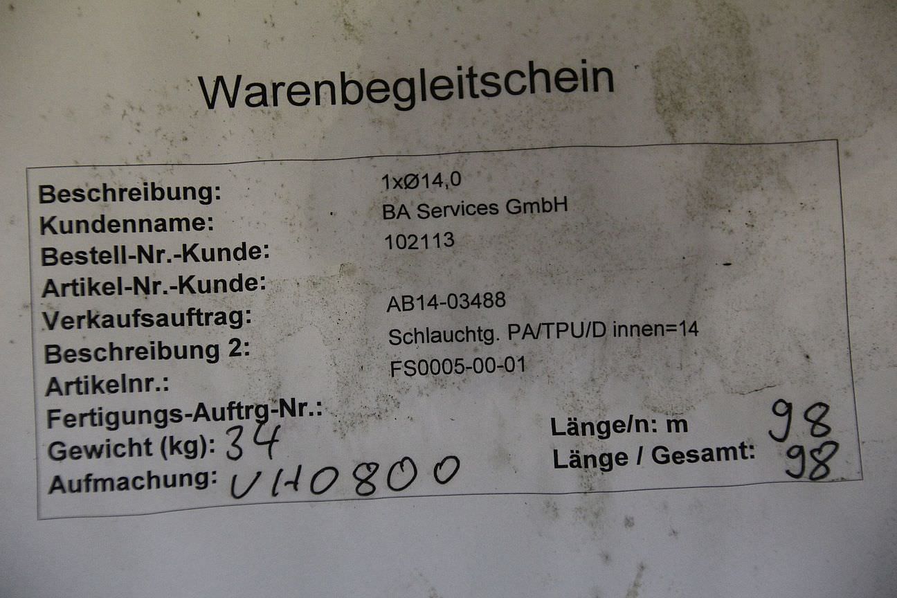 Thermoplastic polyurethane elastomers, pressure hose, air hose, plastic hose -Hose: PA/TPU/D inner diameter = 14 -Inner diameter: 14 mm -Outer diameter: 16 mm -Wall thickness: 1 mm -Length: 98 m -Quantity: 1 roll available -Dimensions: 800/800/H535 mm -Weight: 36 kg