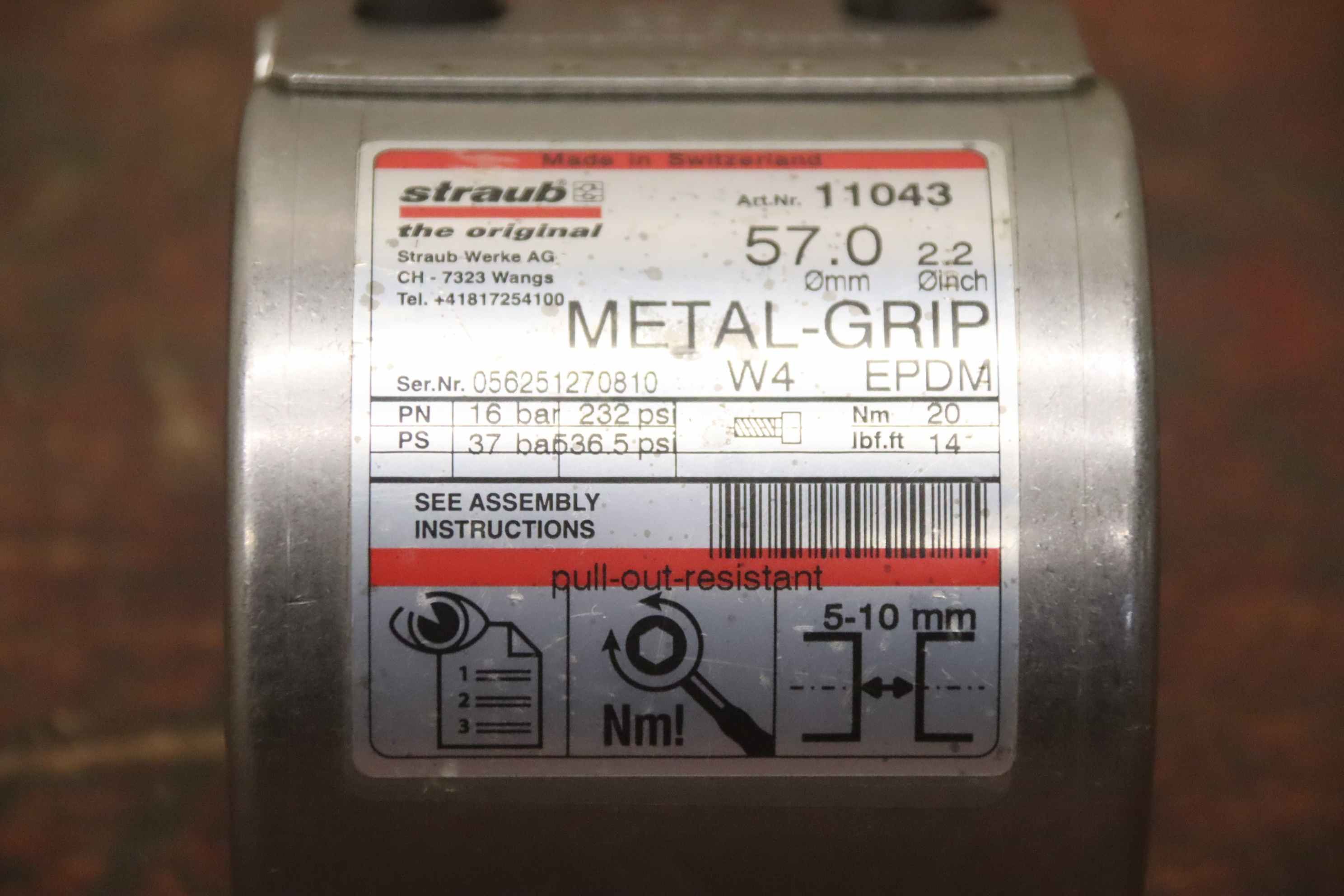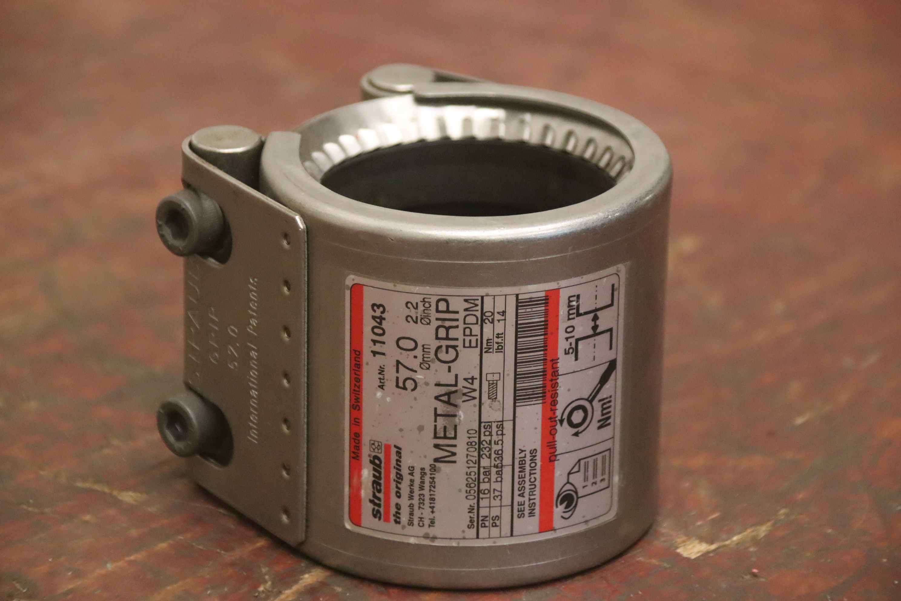 Stainless steel couplings, pipe coupling, pipe sleeve, pipe connection-Manufacturer: Straub, pipe coupling type GRIP-L 57.0-Art.No.: 11043-Inside: Ø 57 mm / 2.2 inch-Clamping range: 56.4 - 57.6 mm-Pressure: 16 bar-Number: 1x clutch available-Dimensions: 90/85/H80 mm-Weight: 0.8 kg