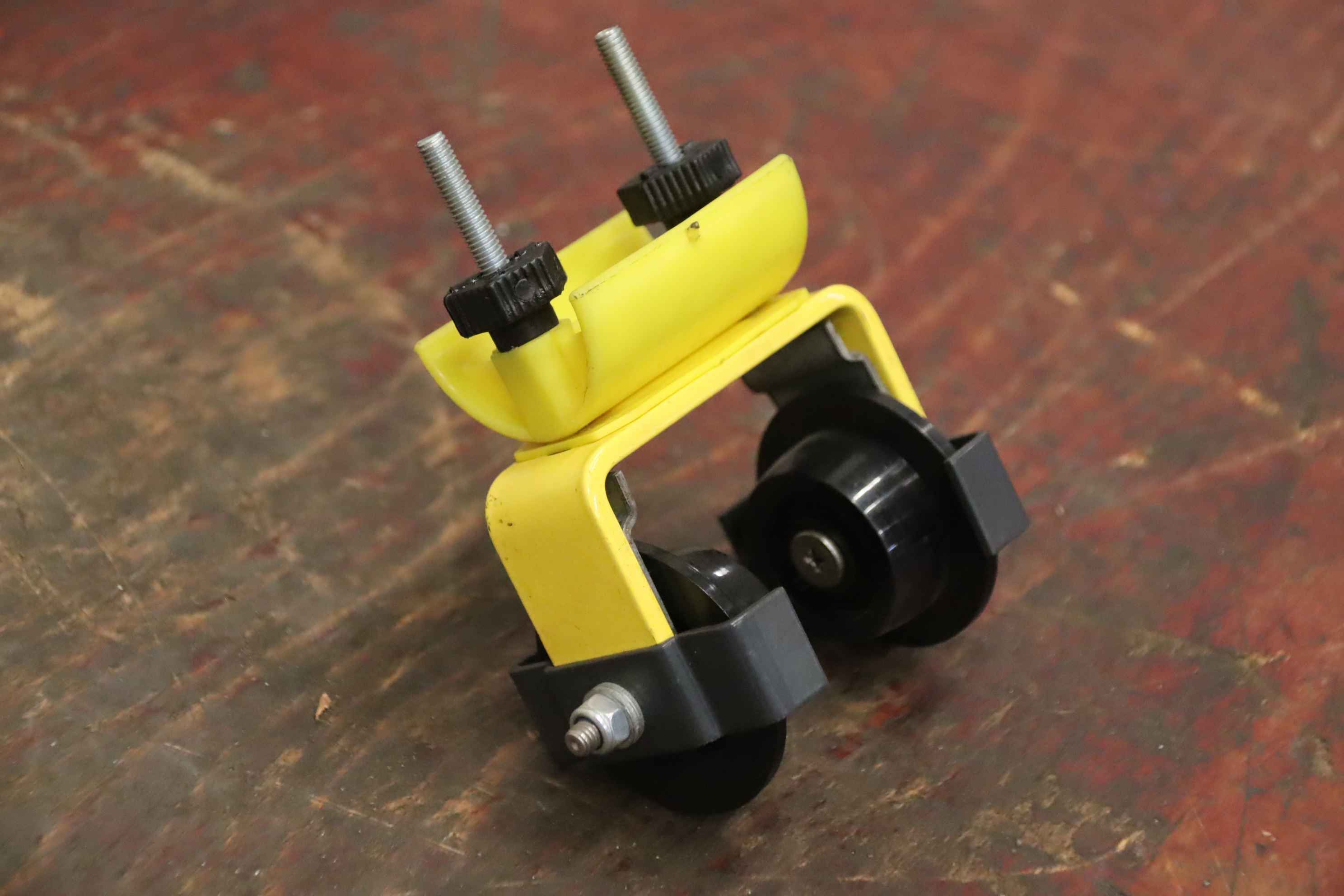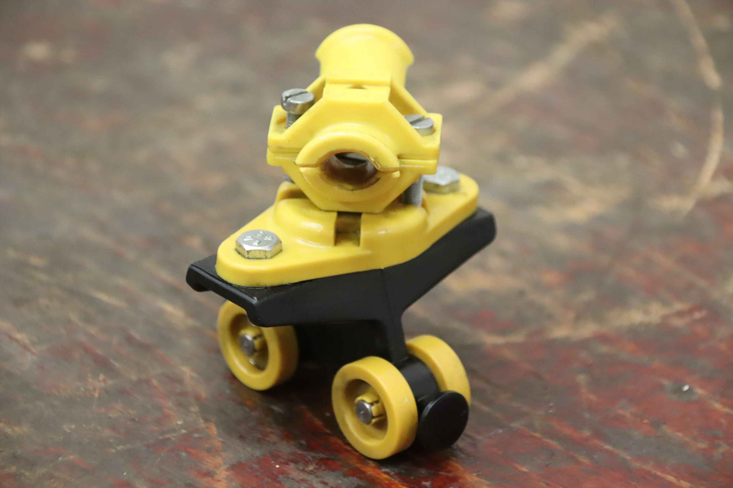 Suspension clamp, clamp sleeve, sliding gate sleeve, cable clamp, cable trolley, cable trolley component, cable holder, cable trolley-Cable trolley: Cable trolley with polyamide rollers-Type: flat cable-Number: 12x holders available-Price: per piece, minimum order 3 pieces-Dimensions: 115/65/H135 mm-Weight: 0.4 kg/piece