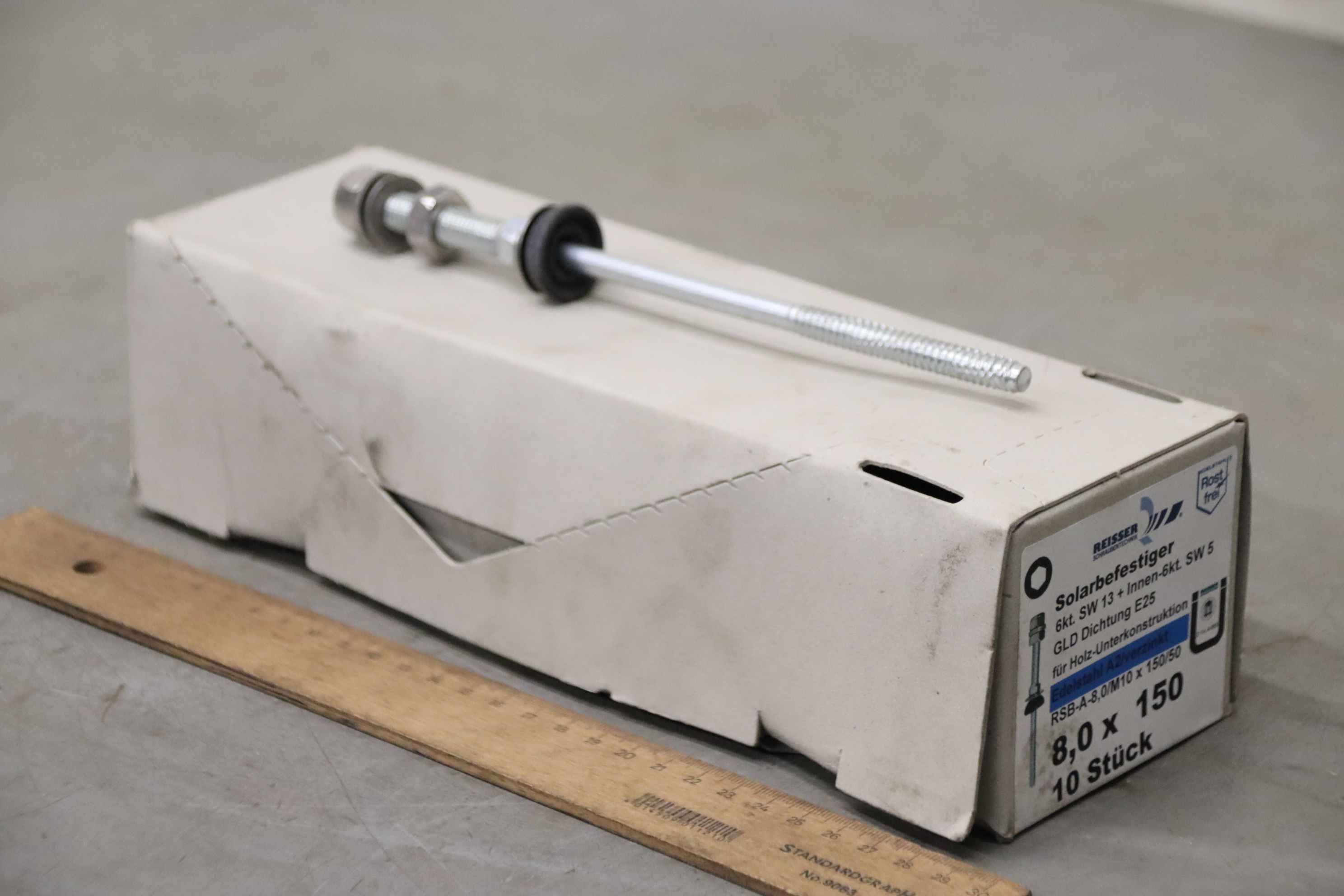 Screws, washers, stainless steel screws, VA screws, wood screws, hanger bolts, solar fasteners -Manufacturer: Reisser, solar fastener 8.0 x 150 10 pieces/carton -Type: RSB-A-8.0/M10 x 150/50 -Material: A2 stainless steel/galvanized -Quantity: 108 boxes available -Price: per box -Carton dimensions: 285/90/H75 mm -Weight: 1.2 kg