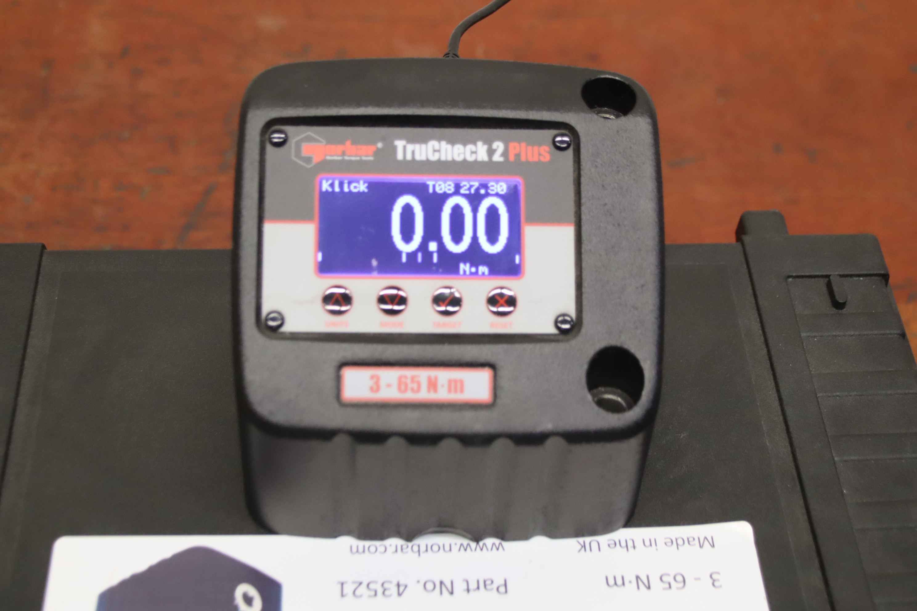 tester, torque wrench, torque tool, torque wrench tester, torque wrench tester-Manufacturer: Norbar, Digital torque tester with case-Type: TruCheck 2 Plus-Part No.: 43521-Measuring range: 3 - 65 Nm-Mounting: 3/8-Accessories: see photos-Dimensions: 205/60/H110mm-Weight: 3.8 kg