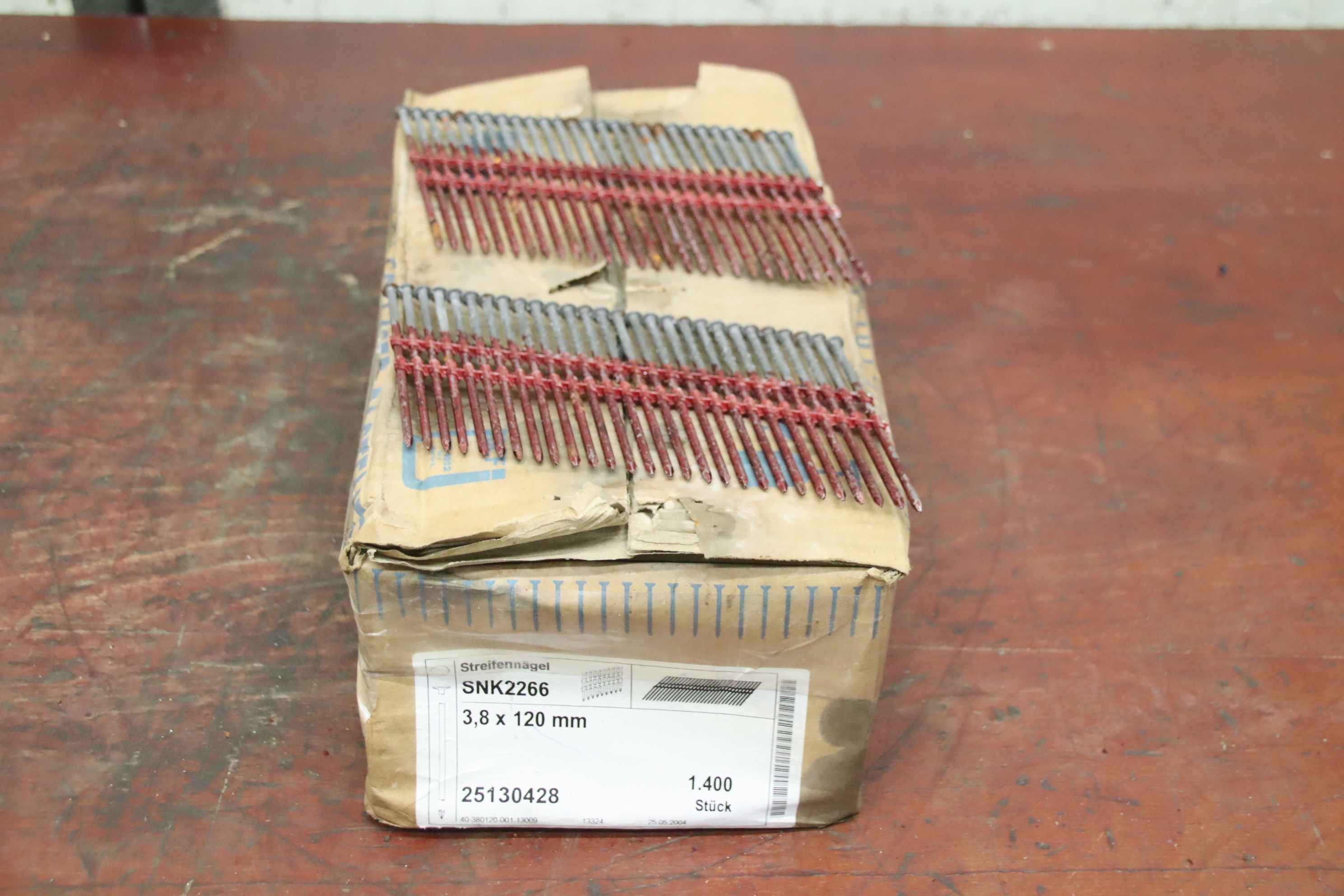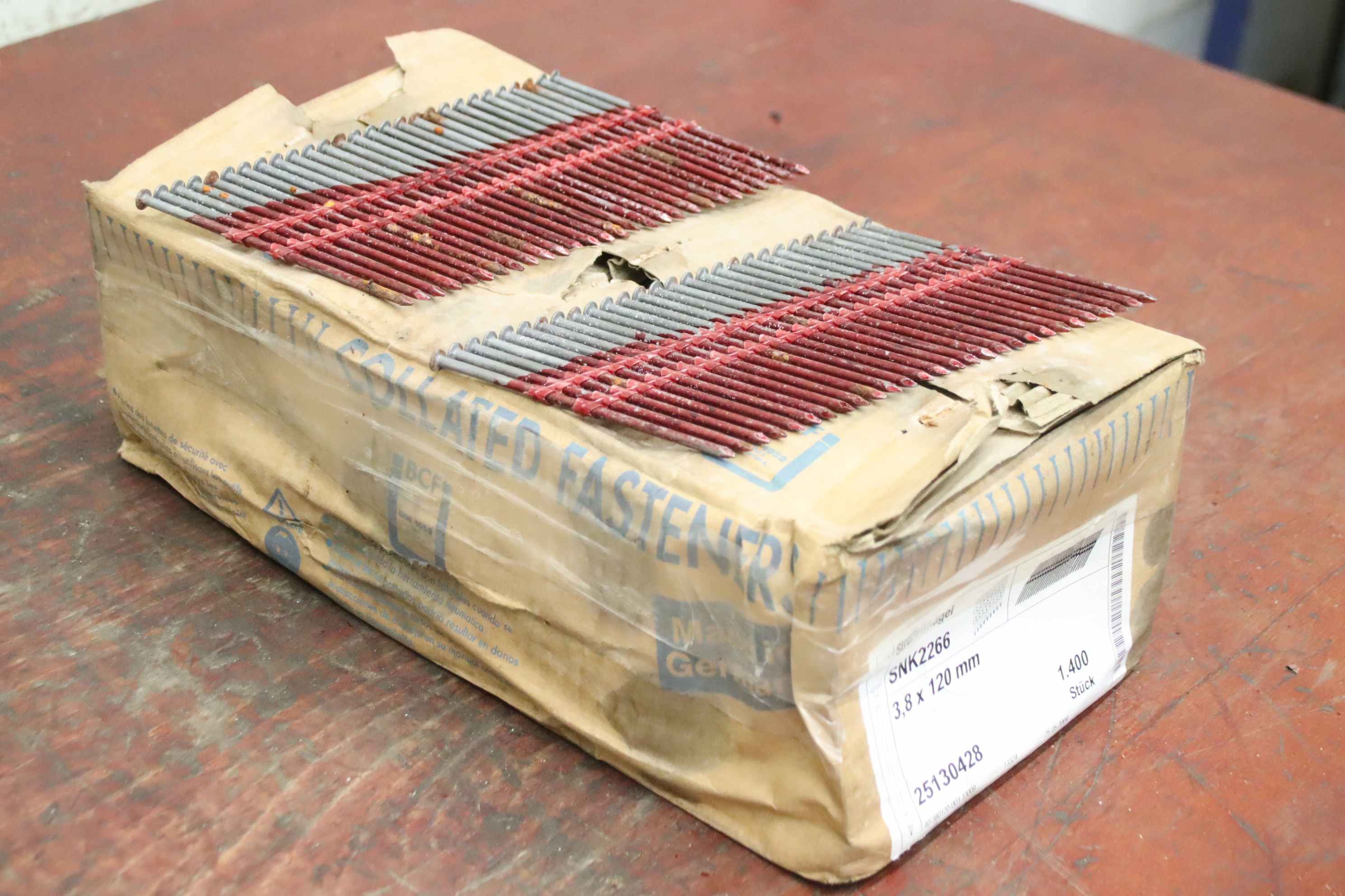 Formwork nails, formwork nails, strip nails, nail strips, compression head nails-Manufacturer: Collated Fasteners, strip nails 1 box/ 1400 pieces-Type: SNK 2266 3.8 x 120 mm-Price/Delivery: complete-Transport dimensions: 380/200/H130 mm-Total weight: 15.4 kg