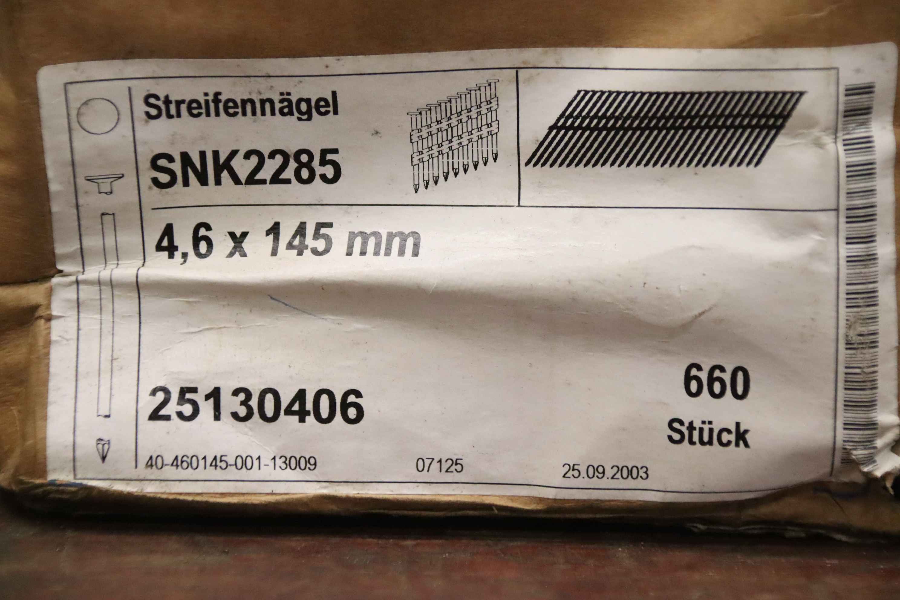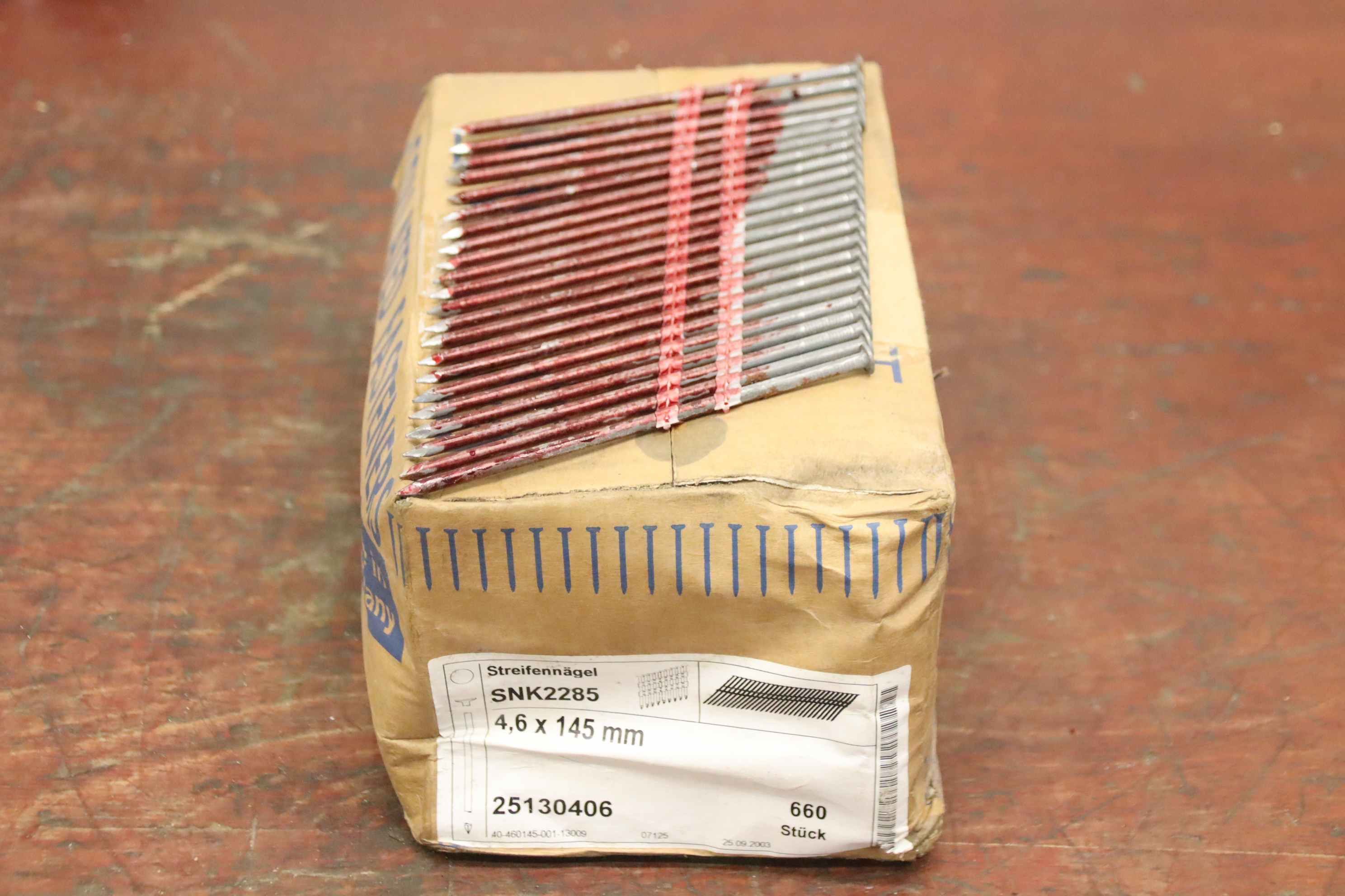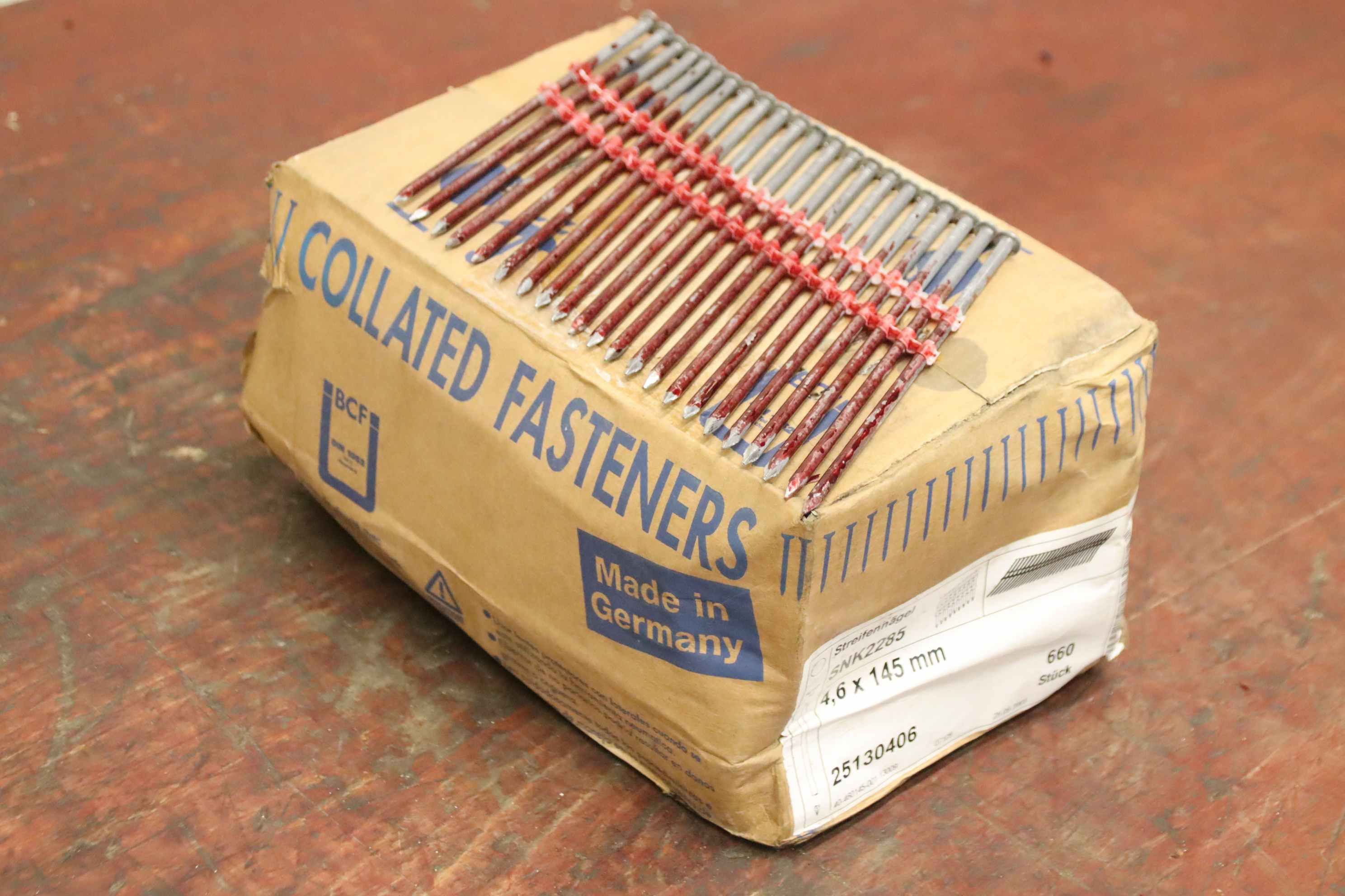 Formwork nails, formwork nails, strip nails, nail strips, compression head nails-Manufacturer: Collated Fasteners, strip nails 1 box/ 660 pieces-Type: SNK 2285 4.6 x 145 mm-Price/Delivery: complete-Transport dimensions: 270/160/H150 mm-Total weight: 12.1 kg