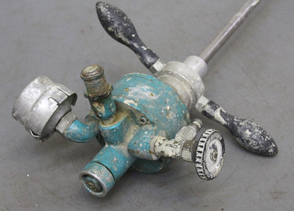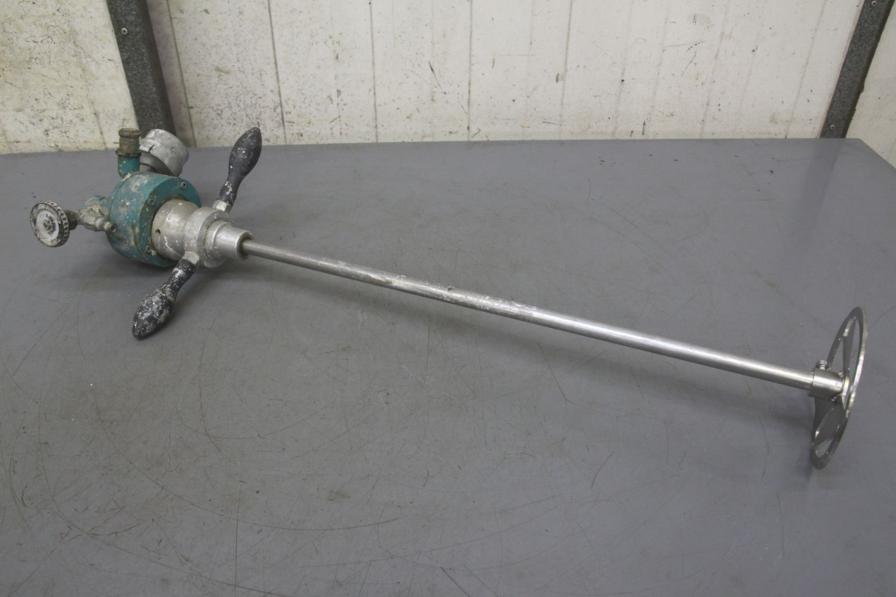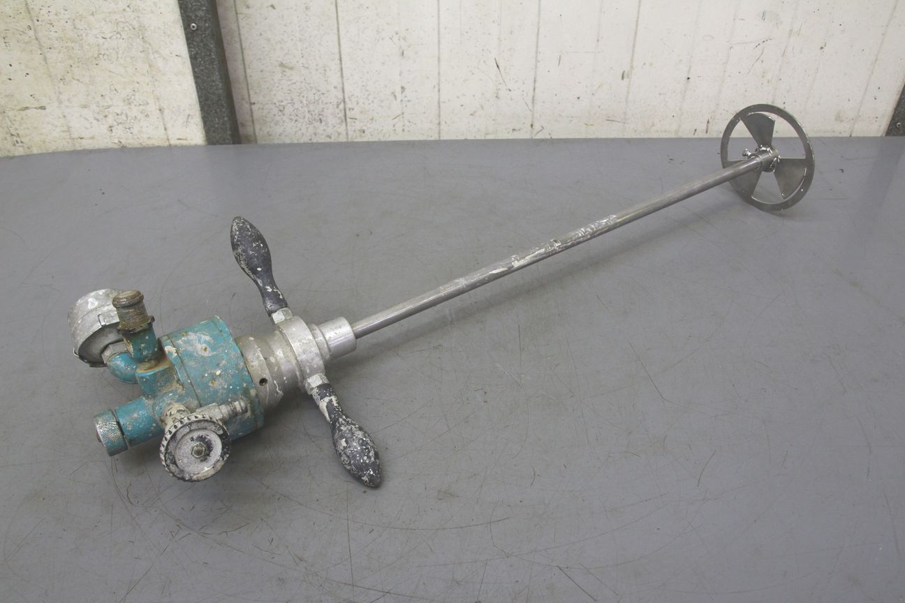 Forced-action mixer, agitator, stirring device, mixing tool, pneumatic hand mixer, pneumatic agitator -Agitator: Pneumatically operated, unfortunately no type designation -Speed: adjustable -Stirring rod: Ø 140 x 600 mm -Overall dimensions: 300/140/H830 mm -Weight: 6 kg