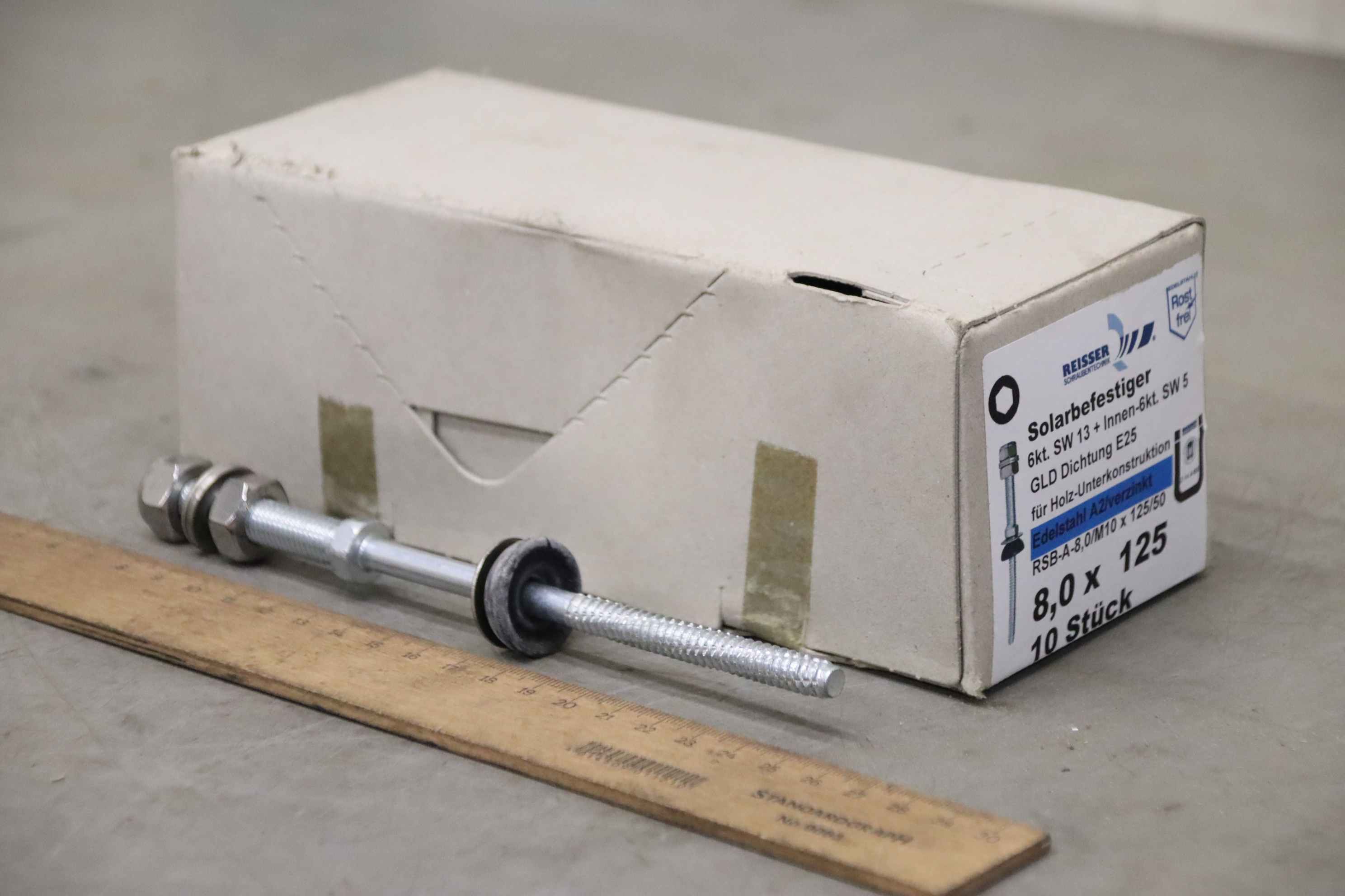 Screws, washers, stainless steel screws, VA screws, wood screws, hanger bolts, solar fasteners -Manufacturer: Reisser, Solar fasteners 8.0 x 125 10 pieces/carton -Type: RSB-A-8.0/M10 x 125/50 -Material: A2 stainless steel/galvanized -Number: 38 boxes available -Price: per carton -Cardboard dimensions: 285/90/H75 mm -Weight: 1.2 kg