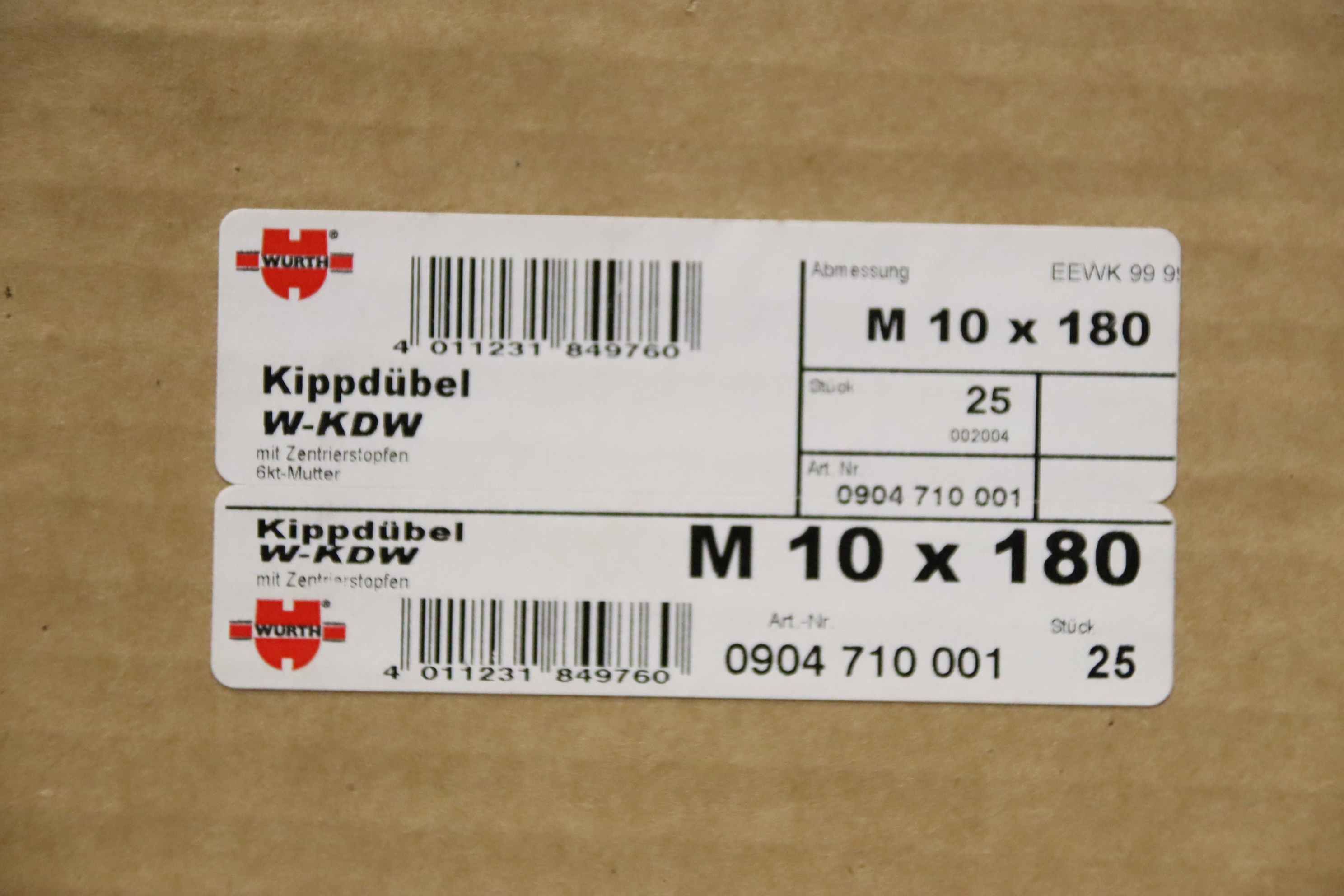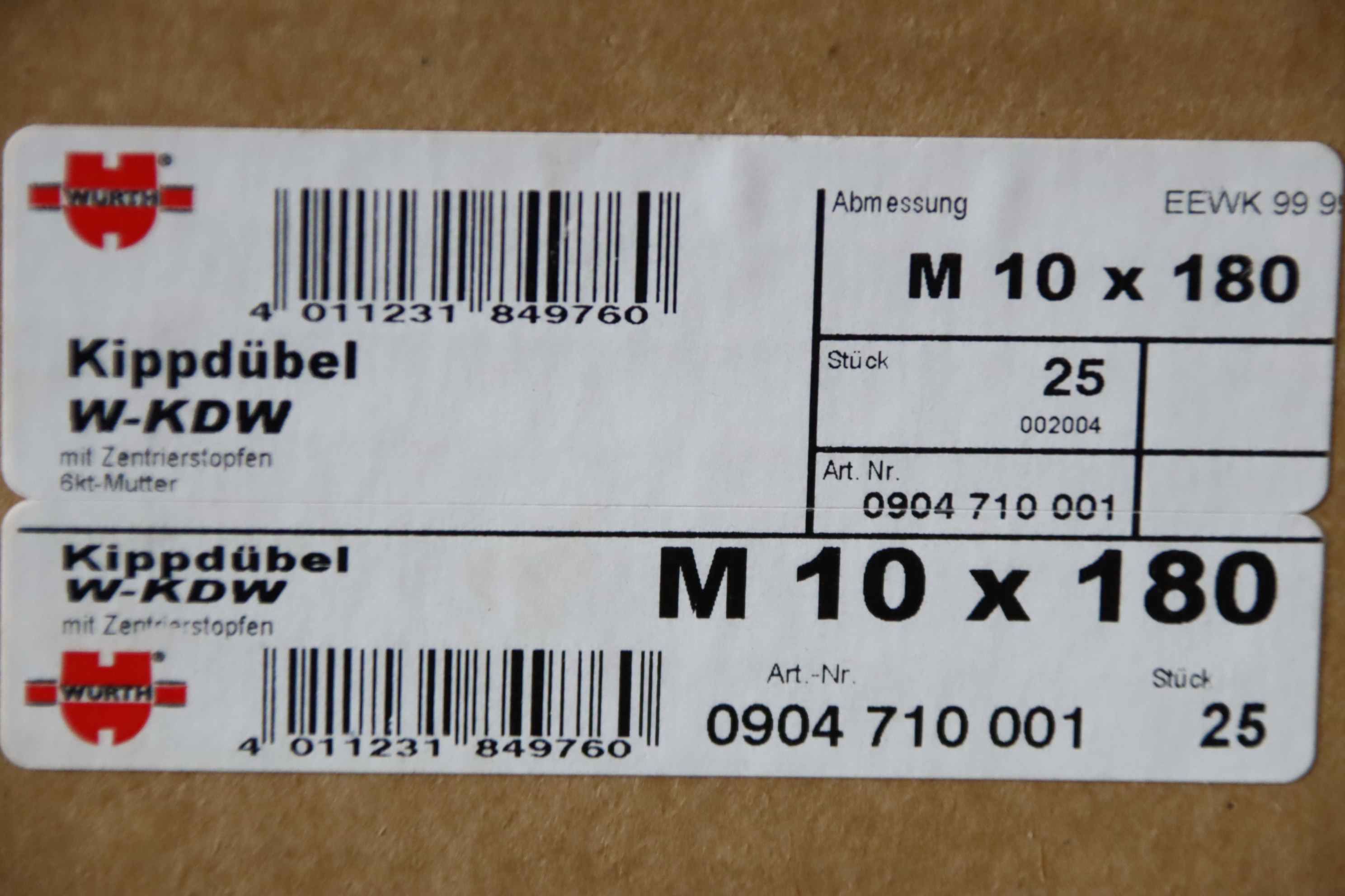 Toggle plug, anchor hook-Manufacturer: Würth, Toggle dowels 25 pieces/box-Type: W-KDW M10x180-Number: 27 boxes available-Price: per box-Dimensions cardboard: 270/210/H100 mm-Weight: 3kg/carton