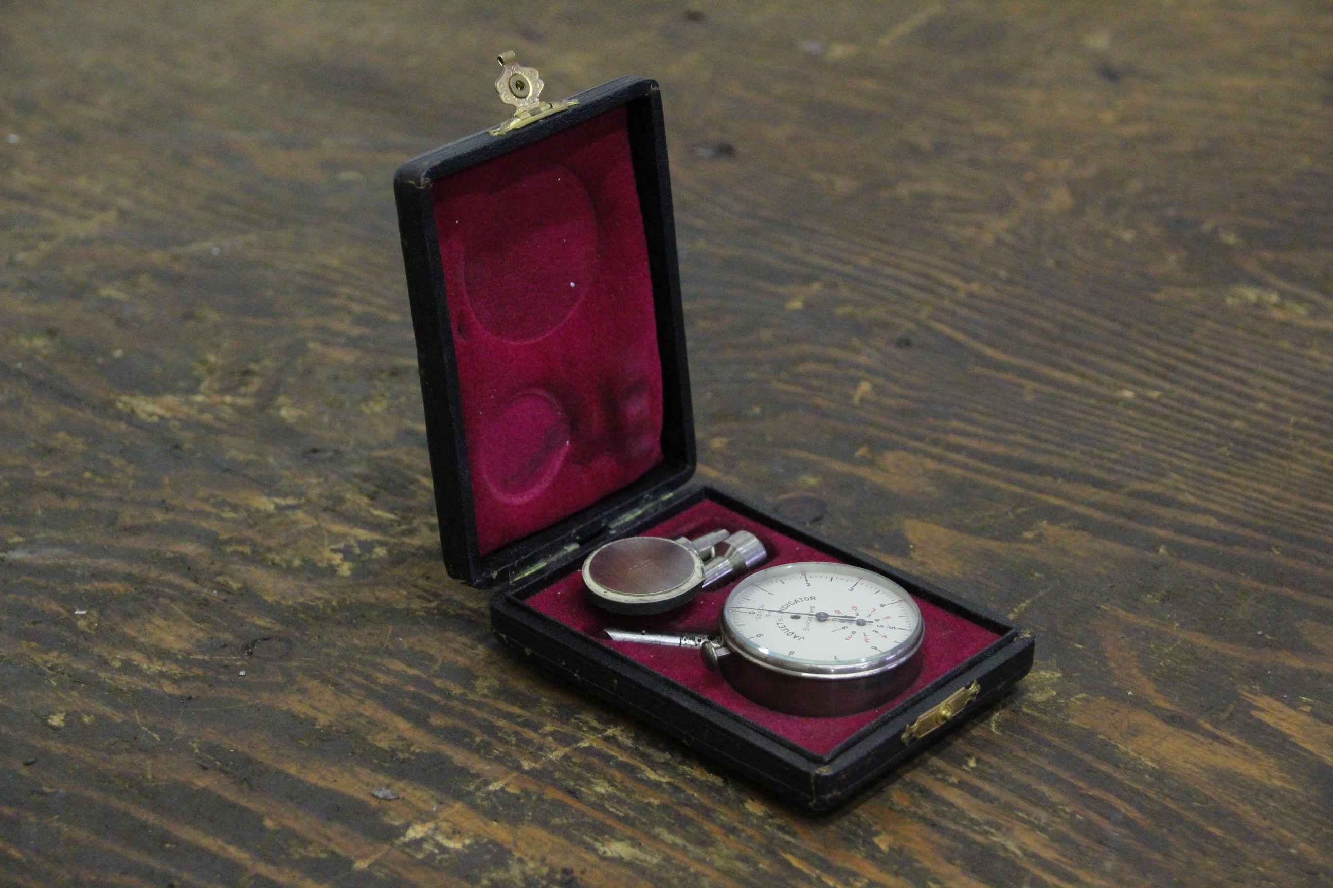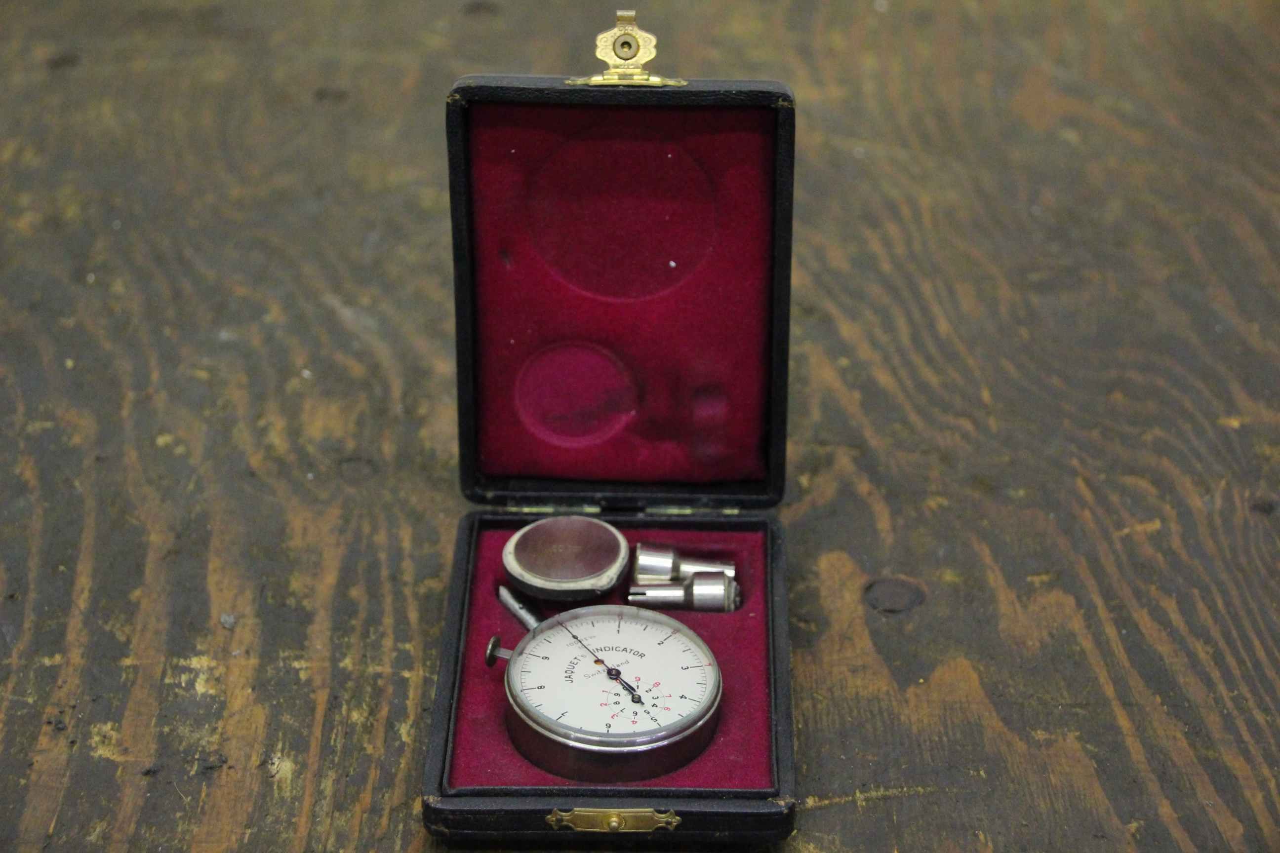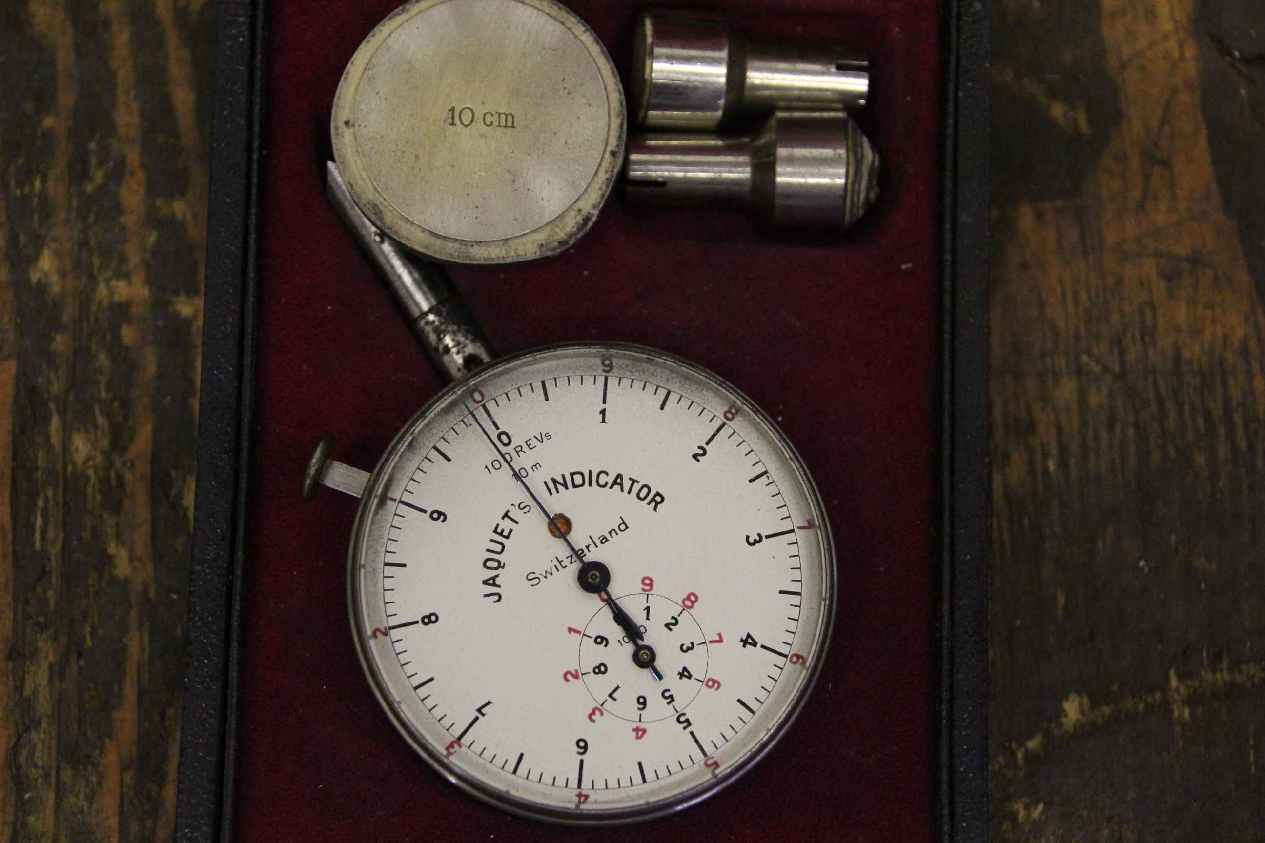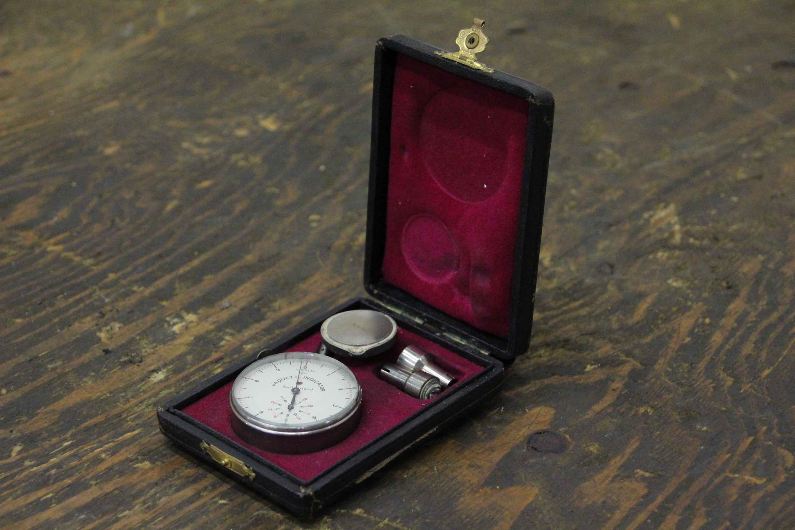 Measuring device for speed or frequency, tachometer, cutting speed measuring device, hand tachometer, revolution measuring device -Manufacturer: Jaquets Indicator 100REVs 10 m -Accessories: see photo -Case: original case -Dimension box: 120/85/H30 mm -Weight: 0.3 kg
