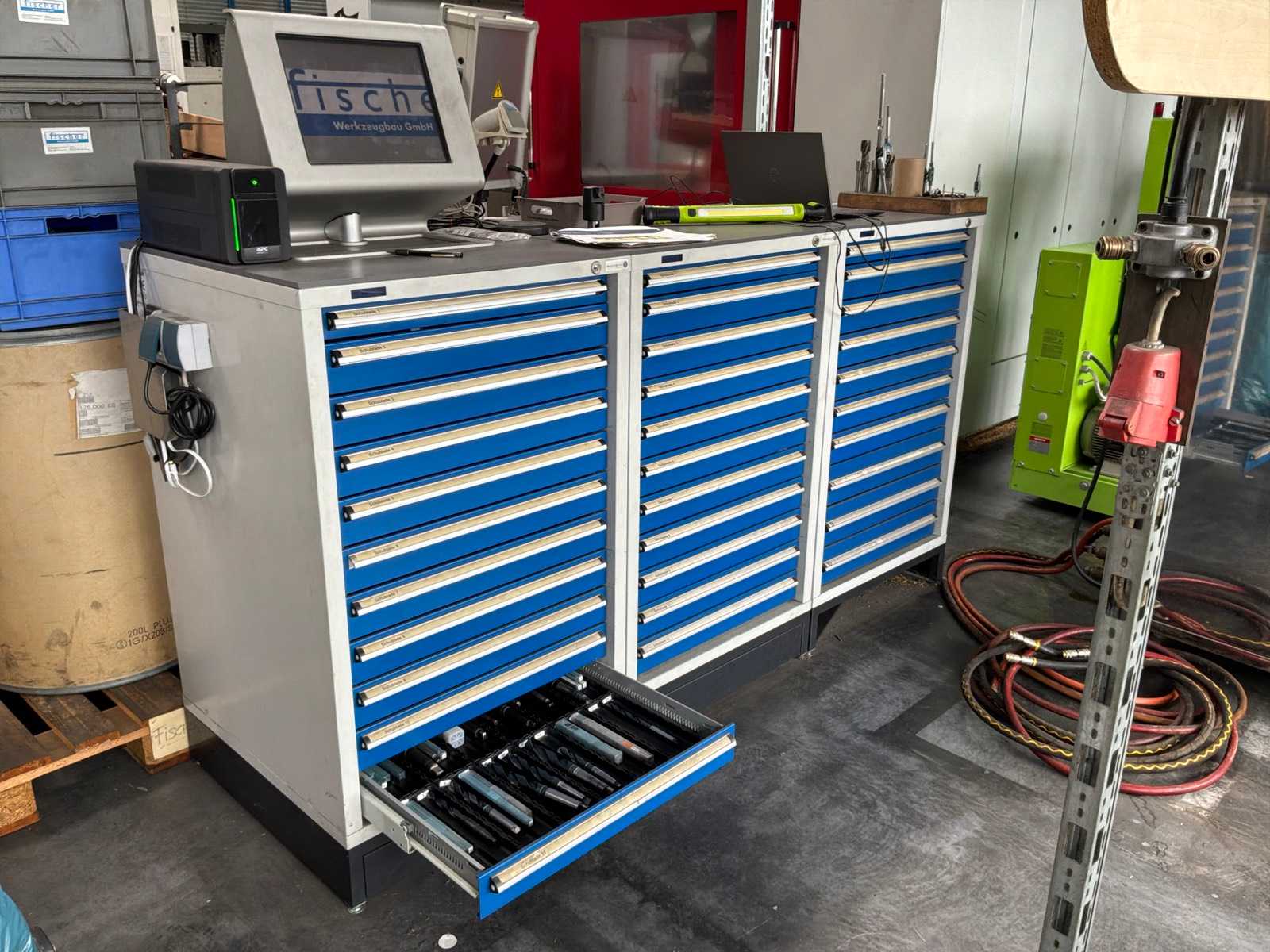 z monitorem dotykowym, UPS, czytnikiem kodów kreskowych, z najbogatszą zawartością. od: wkładek, uchwytów na narzędzia, gwintoży, narzędzi diamentowych i wielu innych. Auction-ID: A1-44702-149